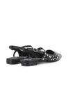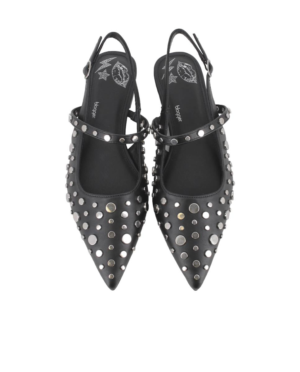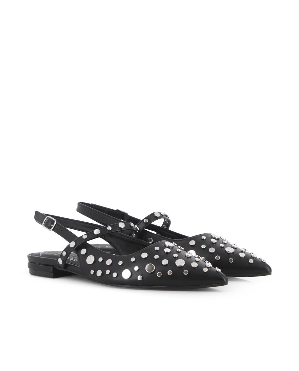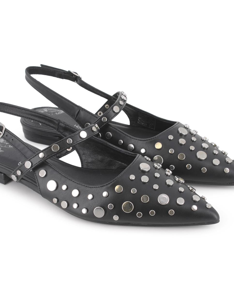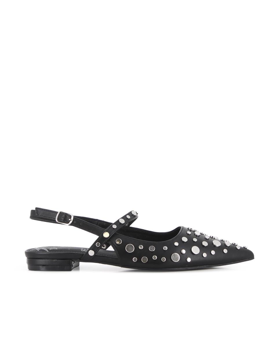 Bailarinas destalonadas en piel sintética color negro con elegante terminado en punta. Decoradas con tachuelas metalizadas en la parte superior para un toque moderno. Cuentan con piso plano de 1 cm para confort diario, tira en el empeine con elástico y cierre de hebilla para ajuste perfecto. Forro sintético y plantilla en piel.