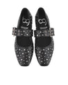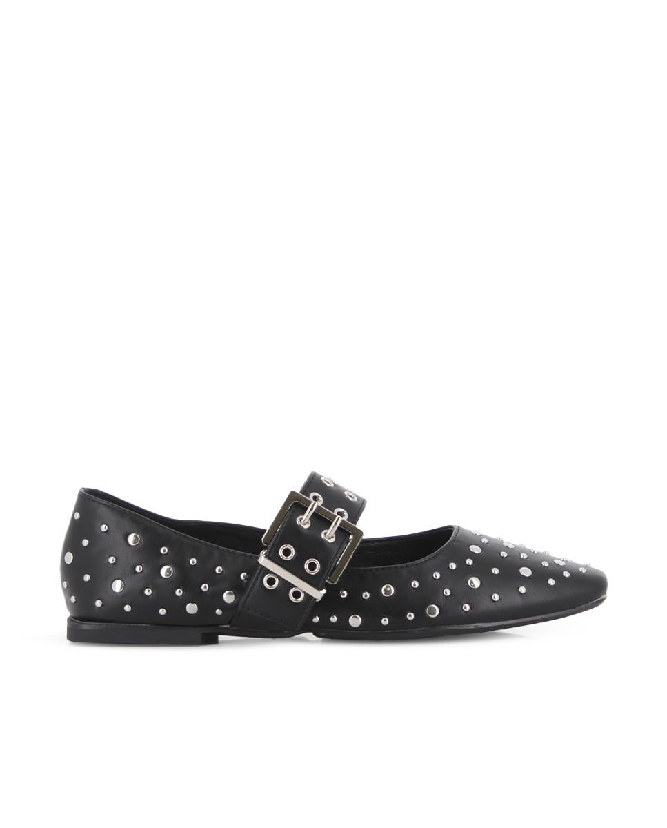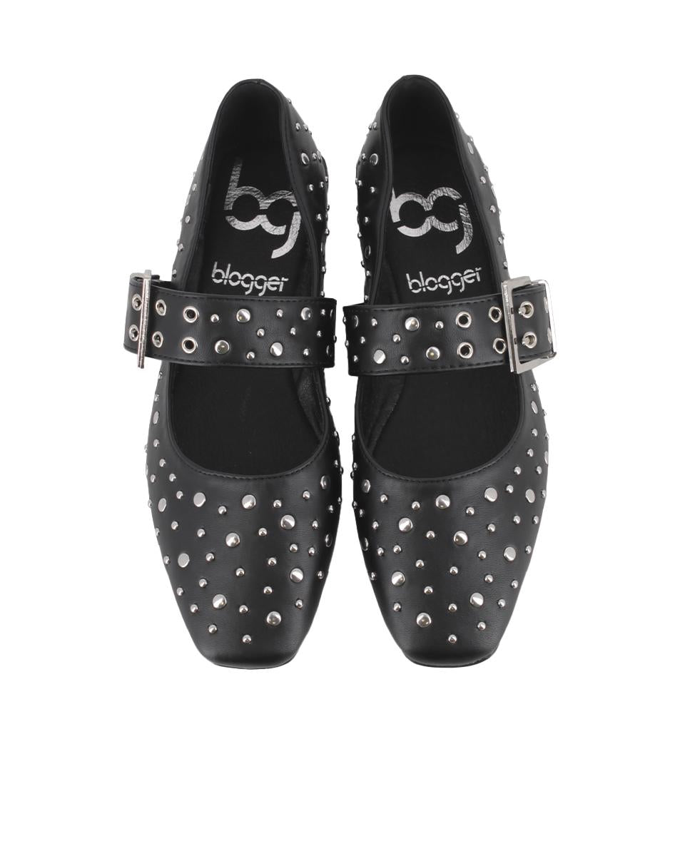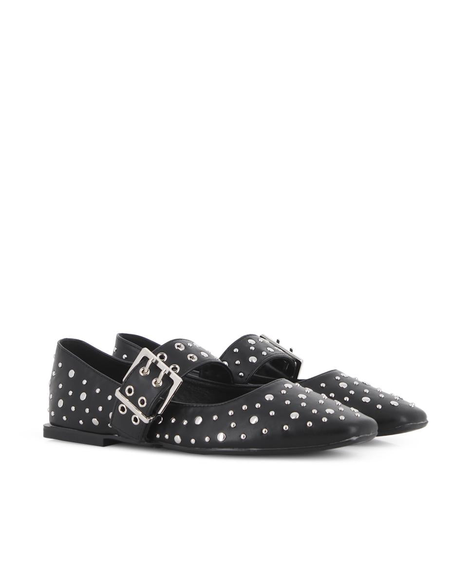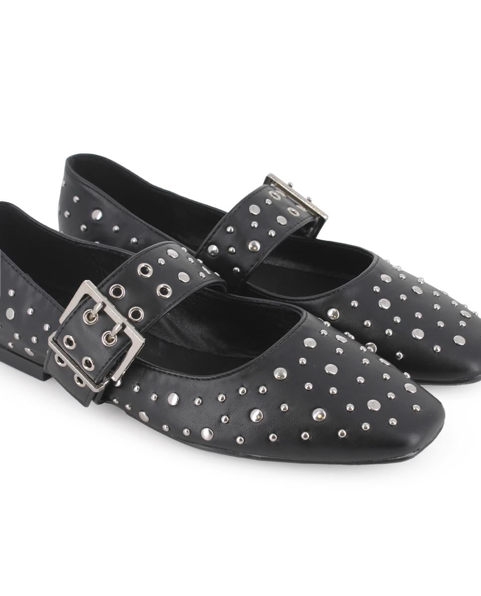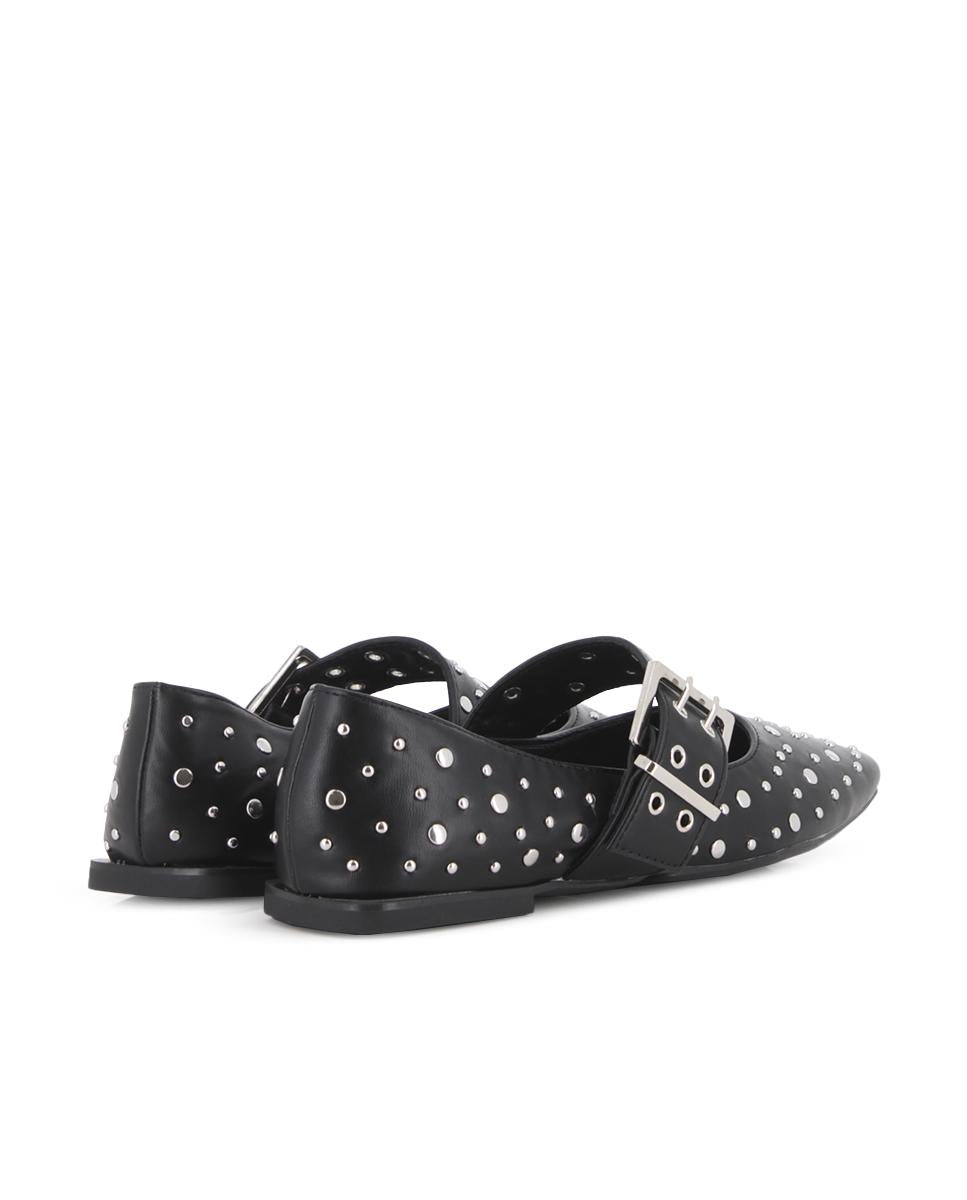 Bailarinas en piel sintética color negro, decoradas en la parte superior con elegantes tachuelas plateadas. Cuentan con tacón ancho de 1 cm de alto para mayor comodidad. Tira en el empeine de 18 cm de largo con ojales metálicos y cierre de hebilla que asegura un ajuste perfecto. Forro sintético y plantilla en piel.
