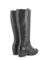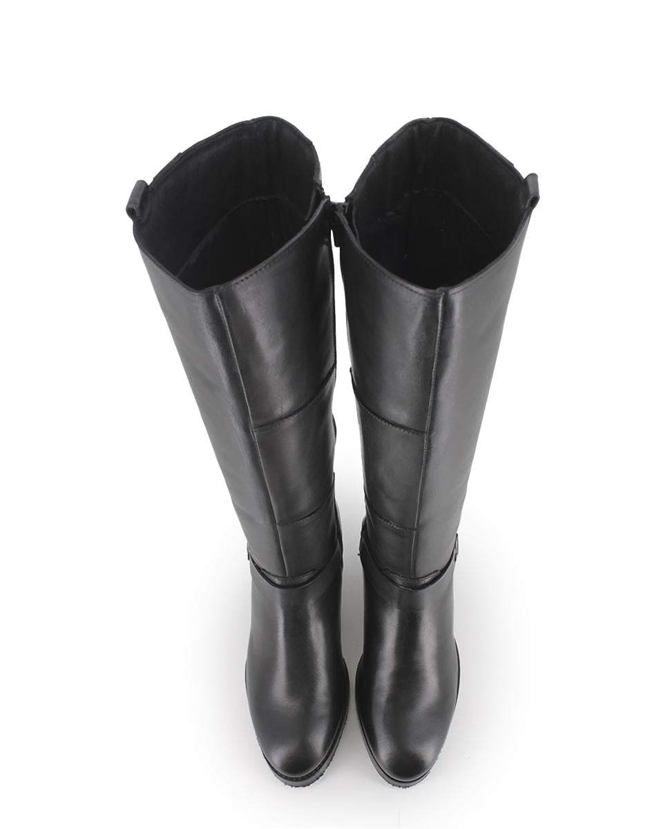 Botas en piel negra con punta afilada y elegante detalle de herrajes laterales. Incorporan un tacón estilo vaquero de 5 cm que aporta estilo y comodidad. La caña mide 37 cm desde el talón, con una circunferencia de 36 cm para un ajuste favorecedor. Cuentan con cierre lateral de cremallera, forro interior textil y plantilla en piel para mayor confort.