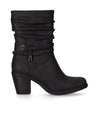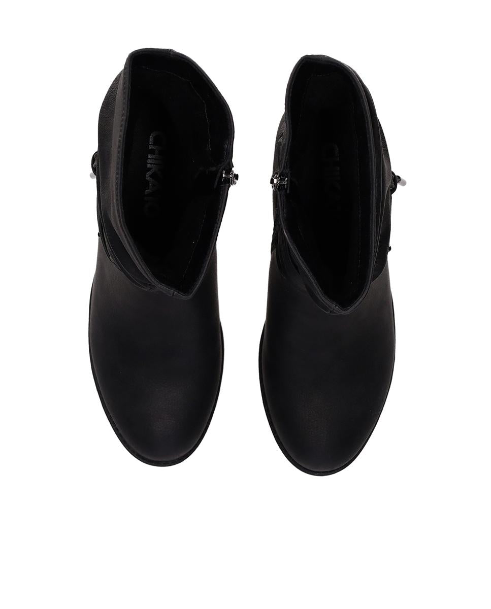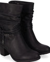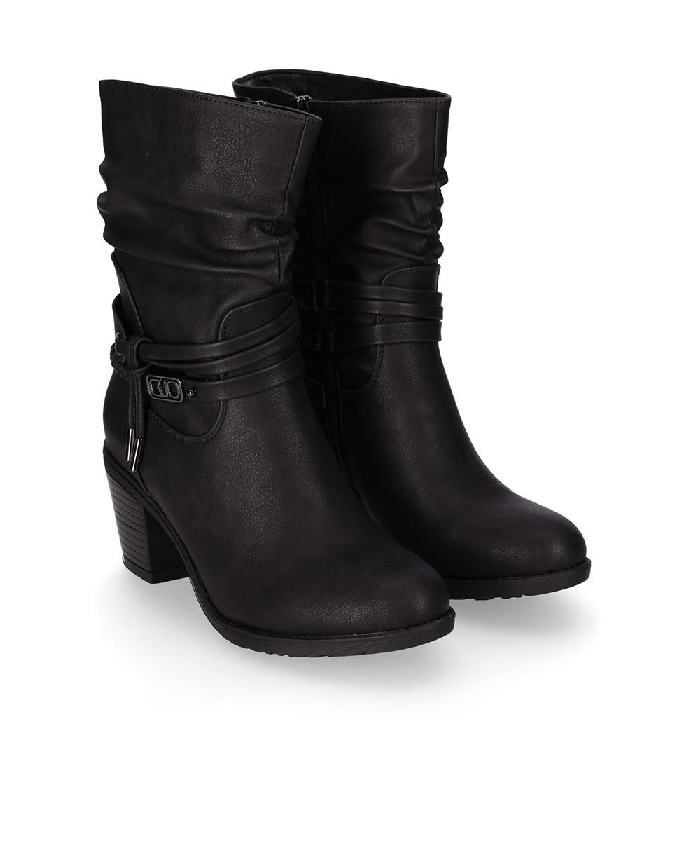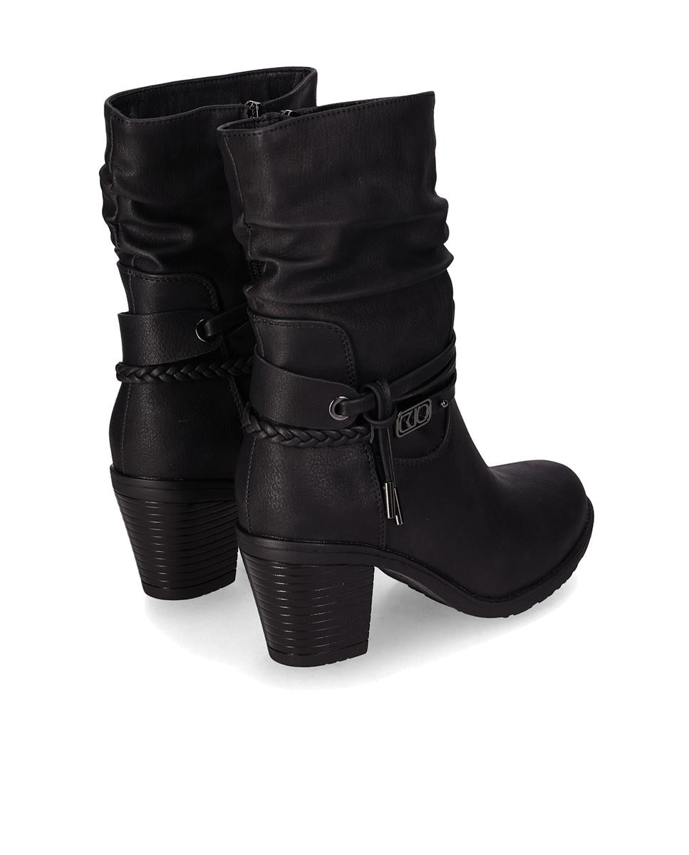 Botines de Chika10 para mujer fabricados en piel sintética color negro. Su diseño destaca por la caña corrugada, una elegante trenza decorativa y tiras en la parte superior. Con punta redonda, cierre con cremallera lateral y un tacón alto y ancho de 7 cm, son ideales para dar un toque distintivo y moderno a tus looks diarios.