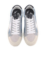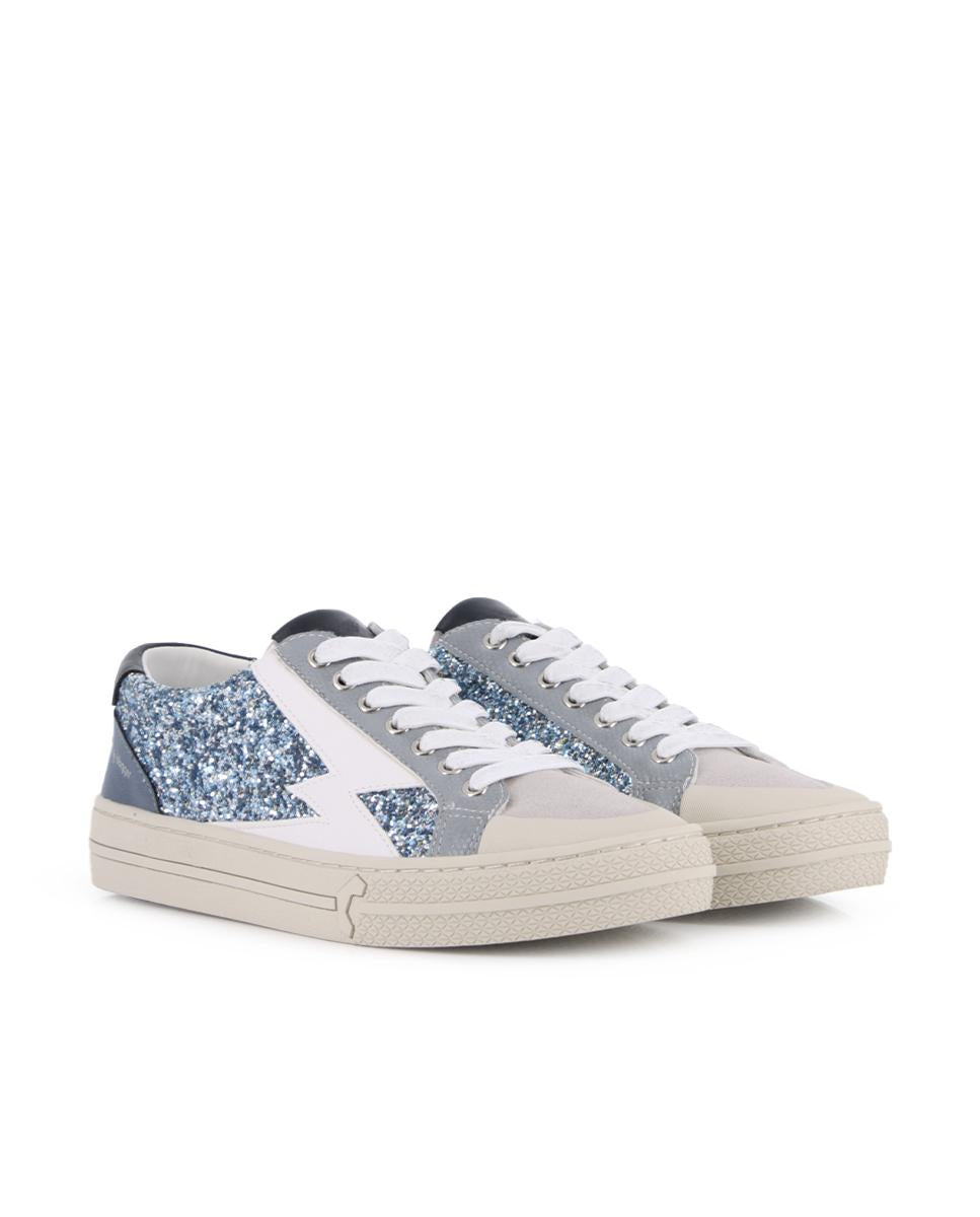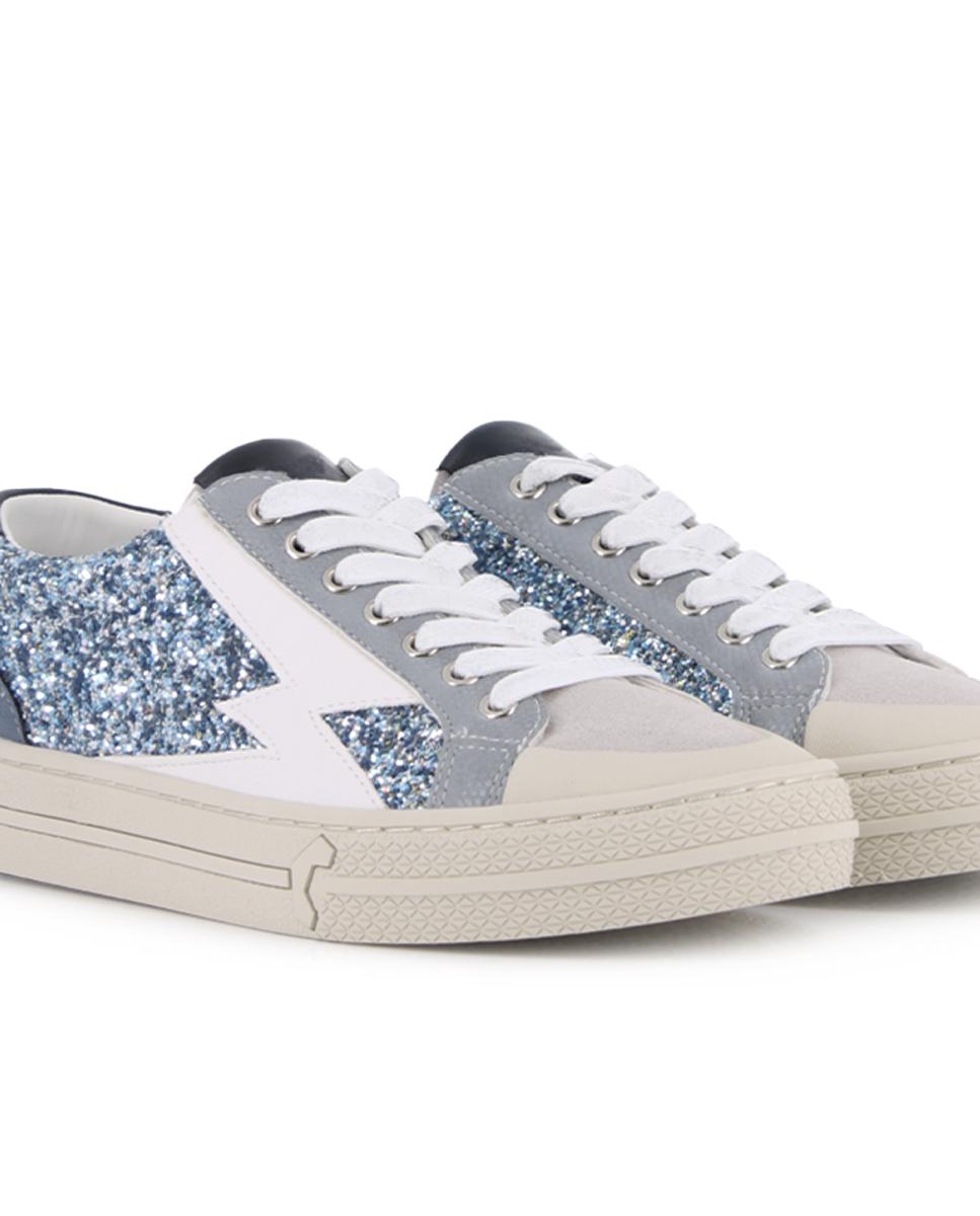 Zapatillas en piel y serraje sintético azul con detalles de purpurina que aportan un toque brillante y original. Piso plano de 2,5 cm para máxima comodidad en tu día a día. Forro interior en textil y plantilla en material sintético. Perfectas para dar un giro moderno y luminoso a tus looks casuales.
