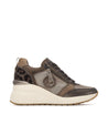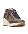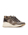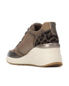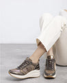 Luce un estilo único con esta zapatilla con cuña de mujer de Carmela, fabricada en piel de alta calidad con detalles en malla en color bronce. Su diseño combina cremallera lateral y cordones ajustables para mayor comodidad. El detalle trasero con estampado de leopardo aporta un toque atrevido. Con plantilla extraíble, suela antideslizante y 6 cm de altura, es ideal para un look urbano elegante.