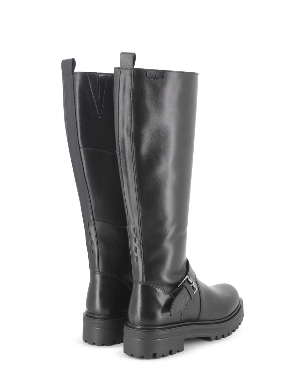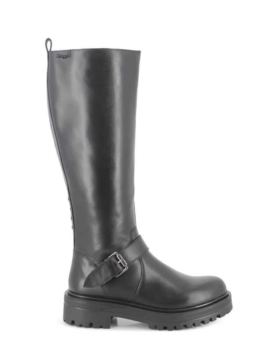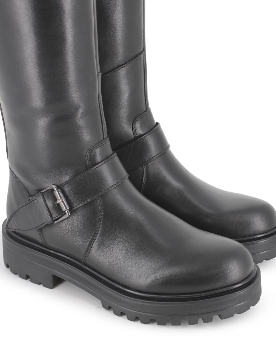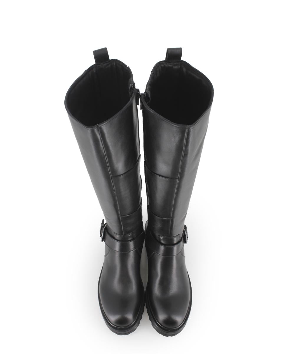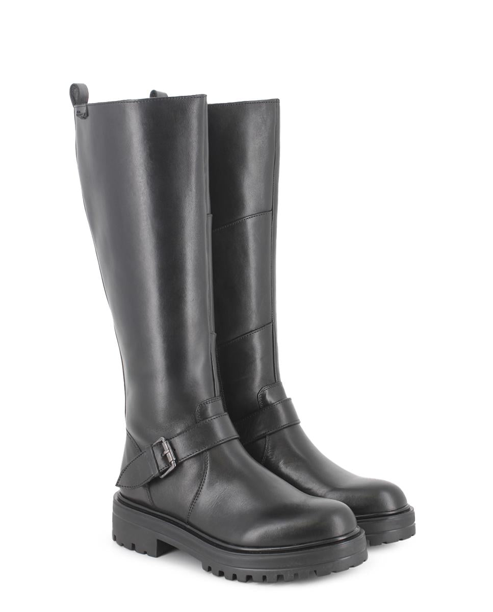 Botas altas en piel negra con elegante detalle de tira con hebilla. Cuentan con una plataforma de 5 cm que estiliza sin perder comodidad. Su caña mide 37 cm desde el talón, con una circunferencia de 36 cm para un ajuste cómodo. Incorporan cierre lateral con cremallera, forro interior textil y plantilla de piel para mayor confort y durabilidad.