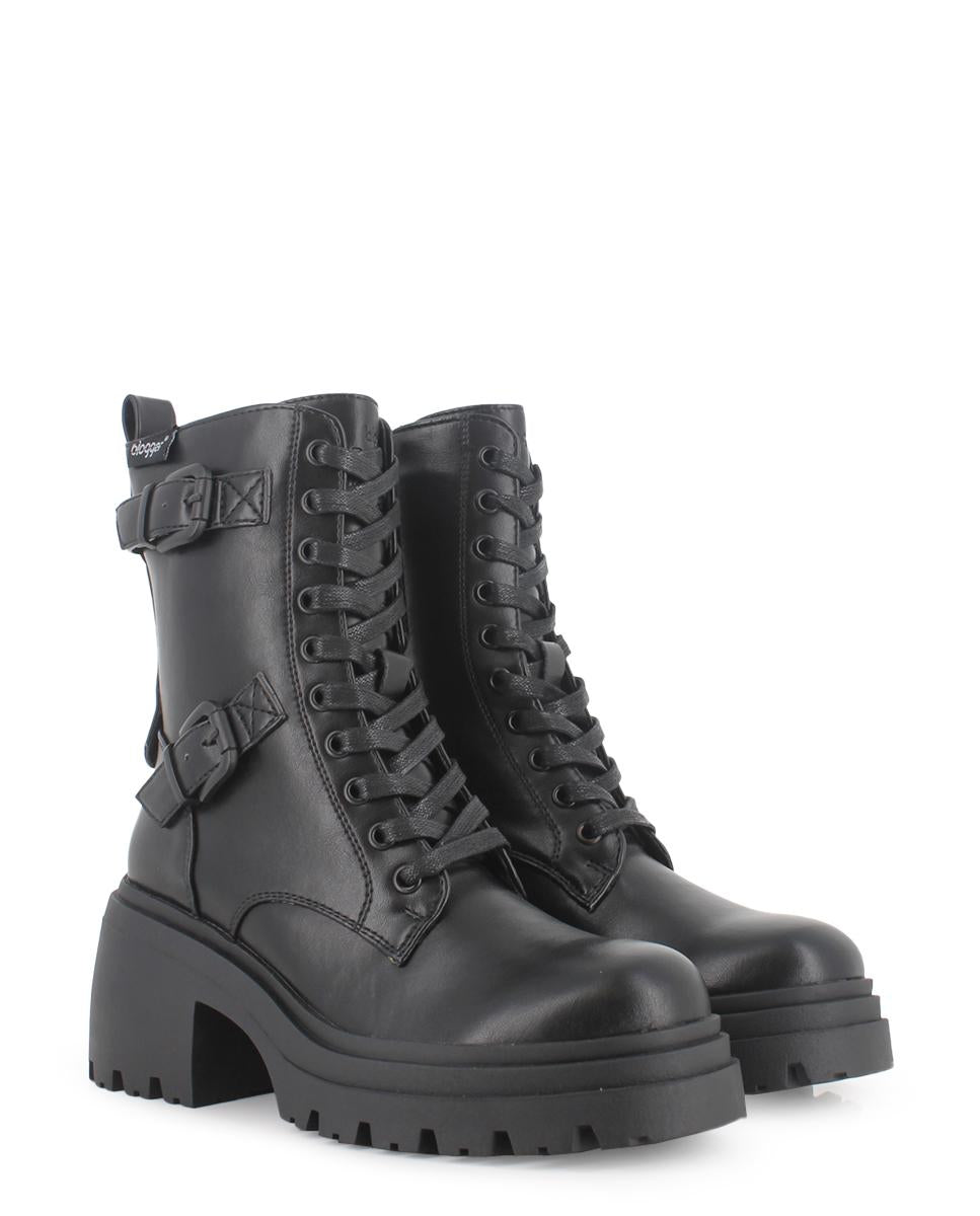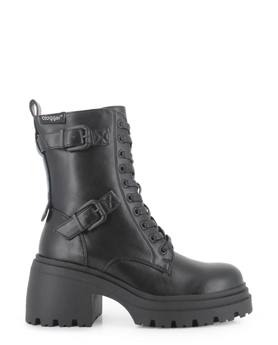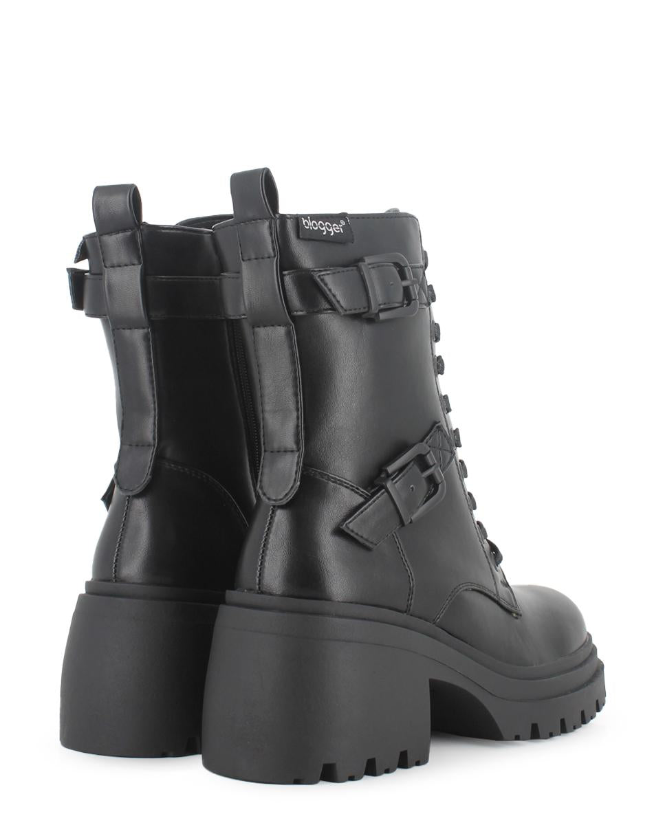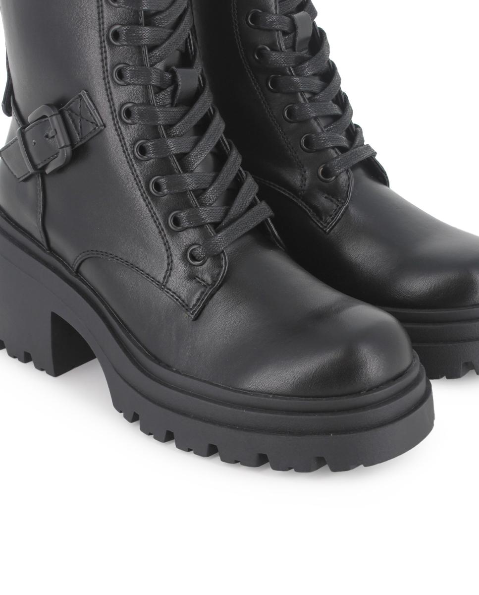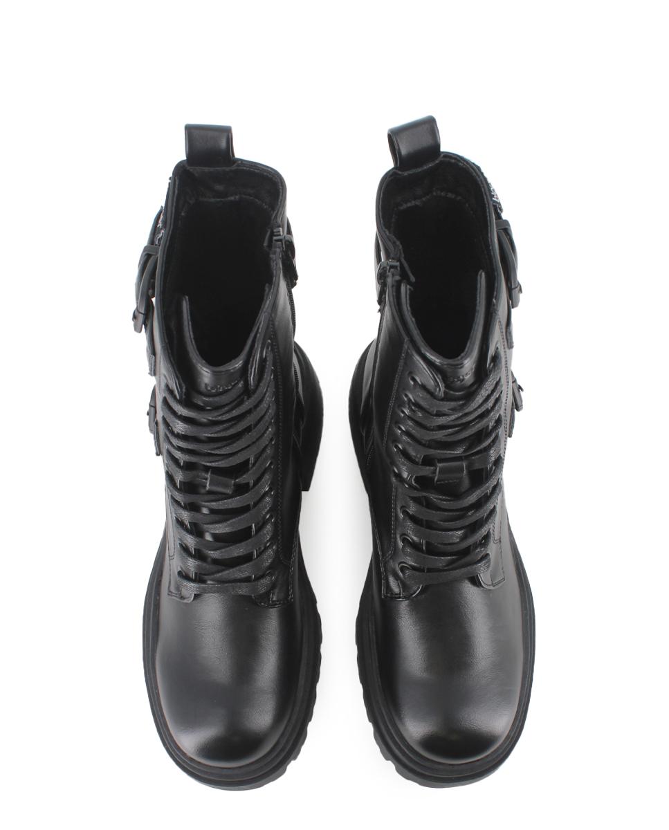Botas de estilo militar, diseñadas para destacar con poder y sofisticación. Confeccionadas en piel sintética negra, presentan caña de 17 cm, cordones y cremallera lateral para un ajuste perfecto. Cintas con hebillas decoran la parte superior. Tacón ancho de 7 cm, suela dentada con gran tracción, plantilla acolchada y forro textil para máximo confort.