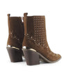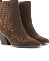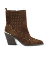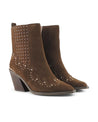 Estilo campero con un toque brillante. Estos botines de Alma en Pena para mujer están fabricados en piel marrón y decorados con detalles dorados en forma de llamas con tachuelas. Su tacón alto de 10 cm aporta altura y presencia, mientras el diseño combina fuerza y feminidad. Perfectos para destacar con estilo en cualquier ocasión.