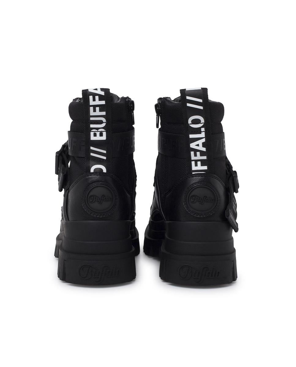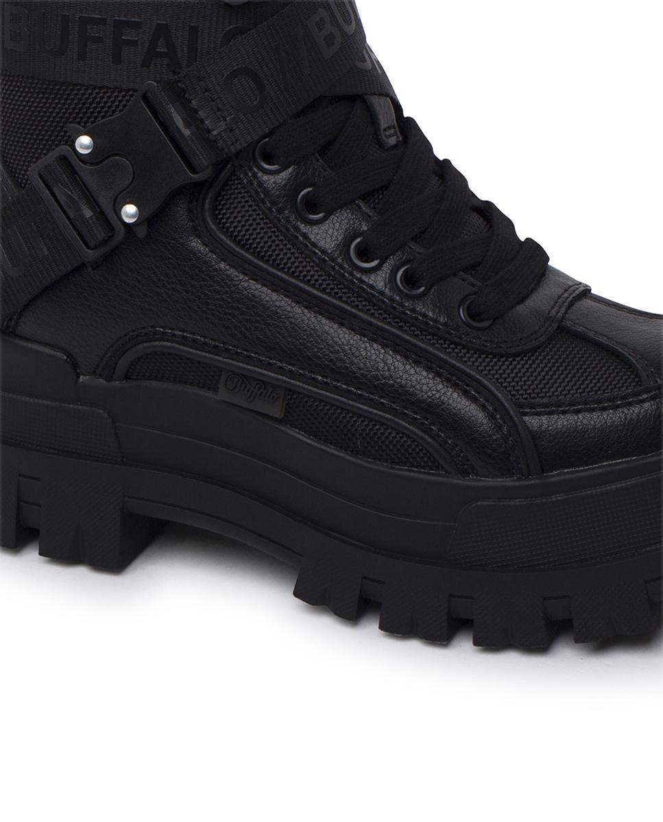 Atrévete con el estilo urbano de Buffalo con estos botines negros de punta redonda. Combinan piel sintética y malla para un acabado moderno con textura. La plataforma de 6 cm aporta altura con comodidad, mientras que el efecto acolchado y las costuras visibles refuerzan su diseño único. Con cierre en cordones y cinta con logo, son la mezcla perfecta de estilo y funcionalidad.