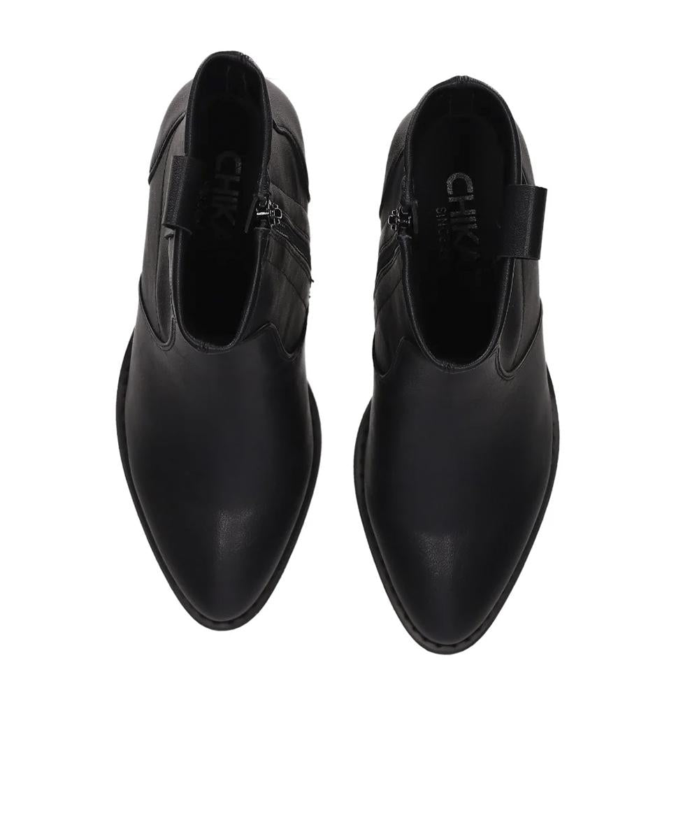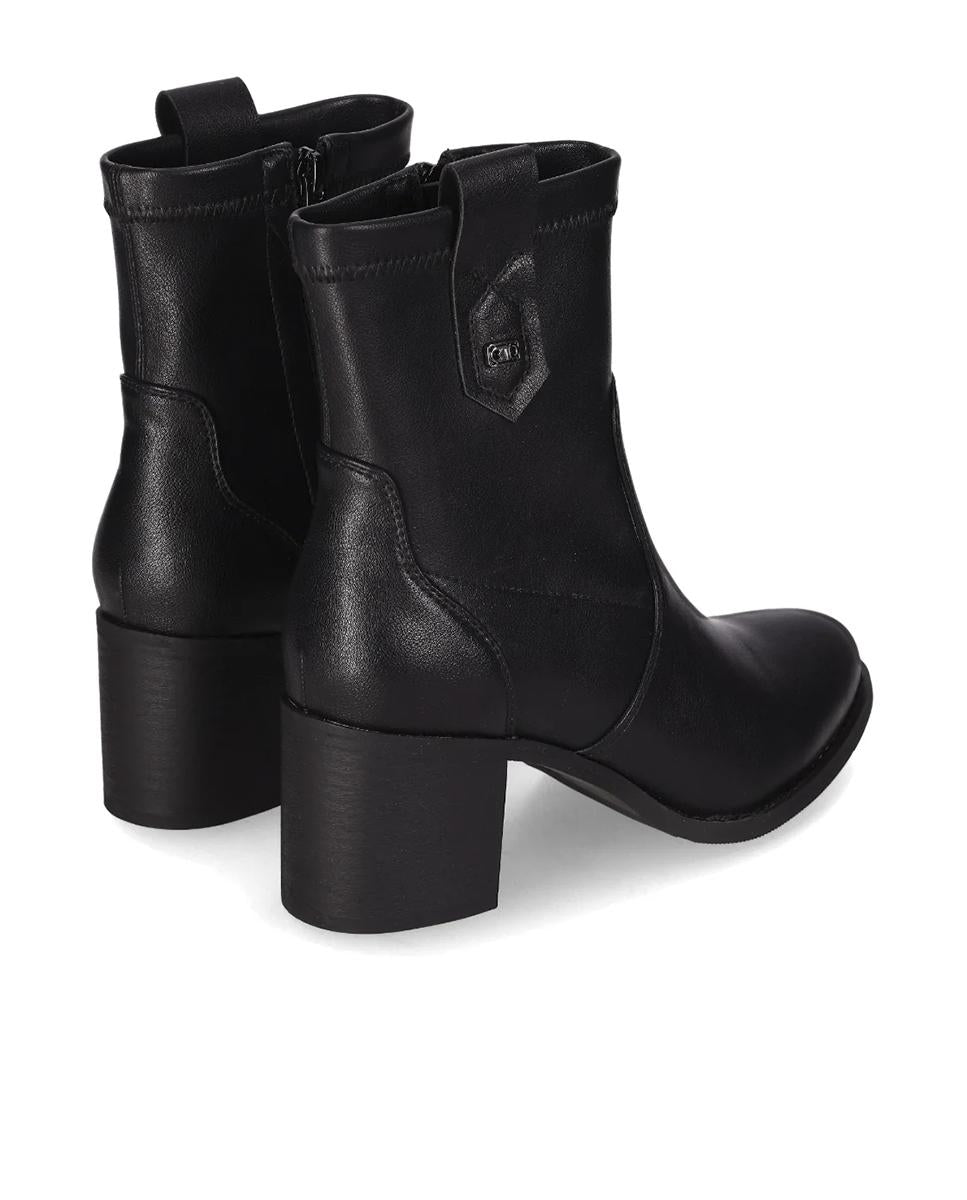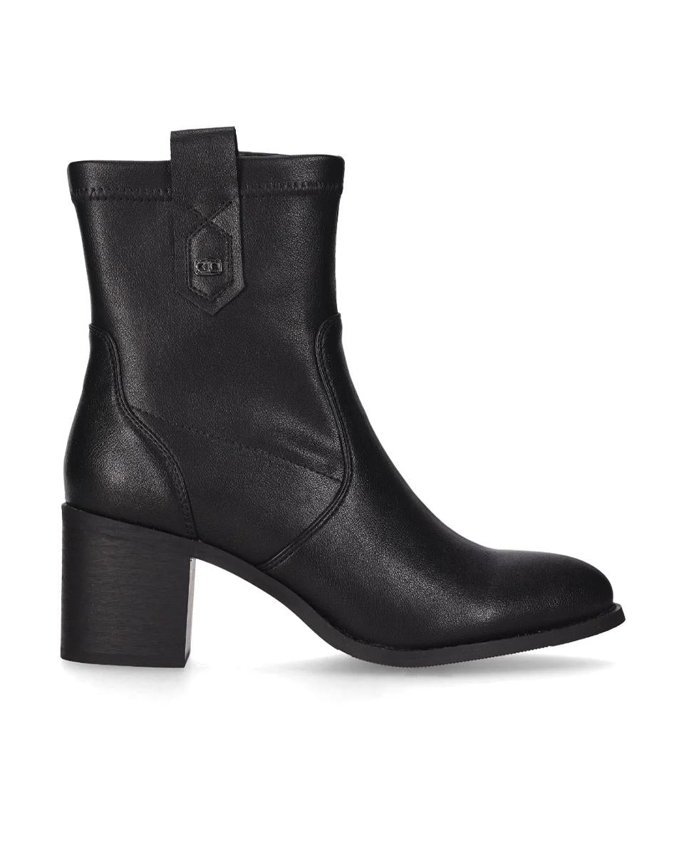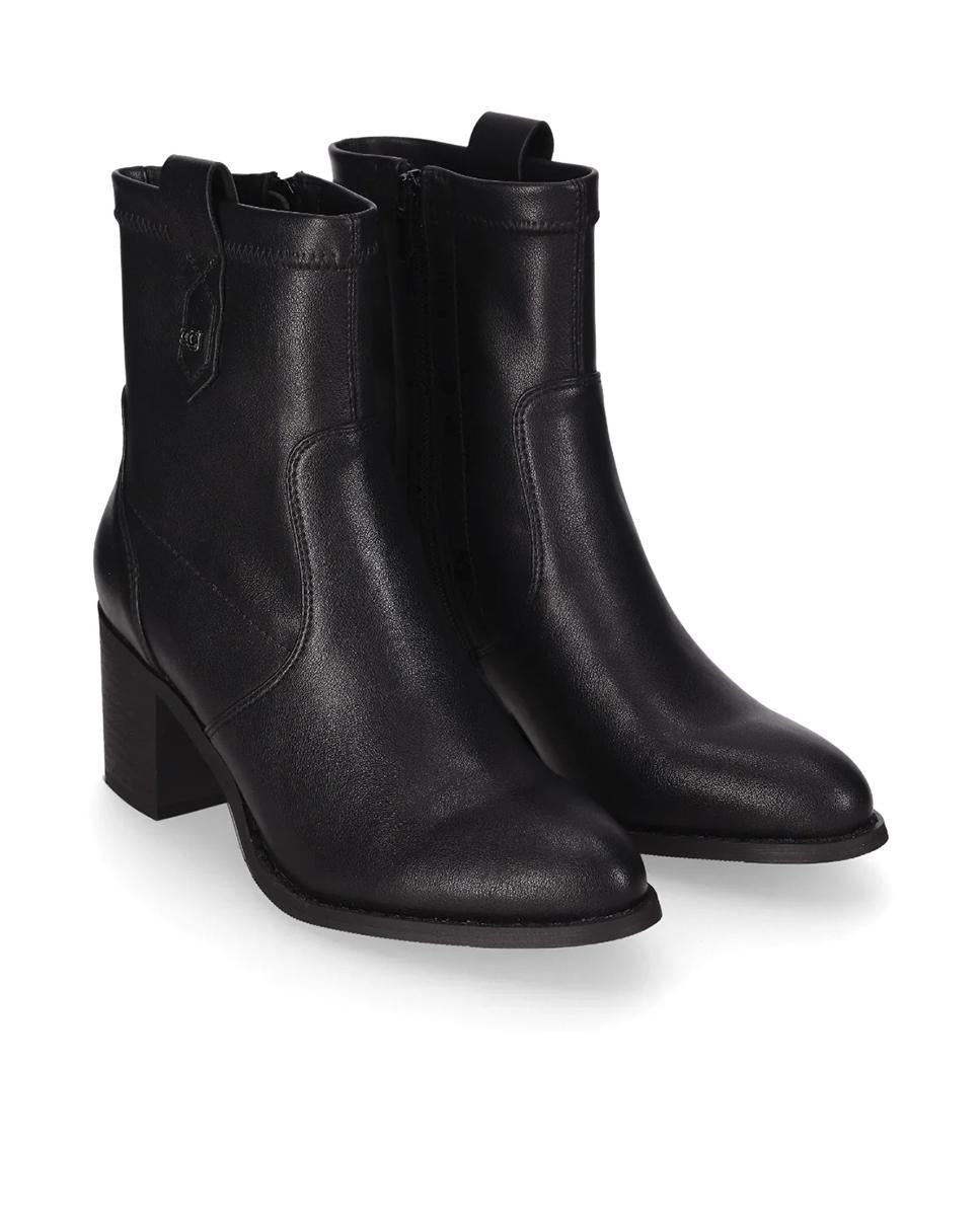 Botín negro de tacón bloque de 5 cm, cómodo y moderno, con costuras decorativas que aportan estilo. Su acabado liso y pulido lo hace versátil para cualquier look, mientras que el tirador superior facilita su colocación. Ideal para combinar con outfits casuales o elegantes, ofreciendo un diseño práctico y sofisticado para el día a día.