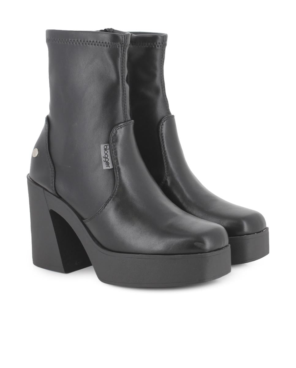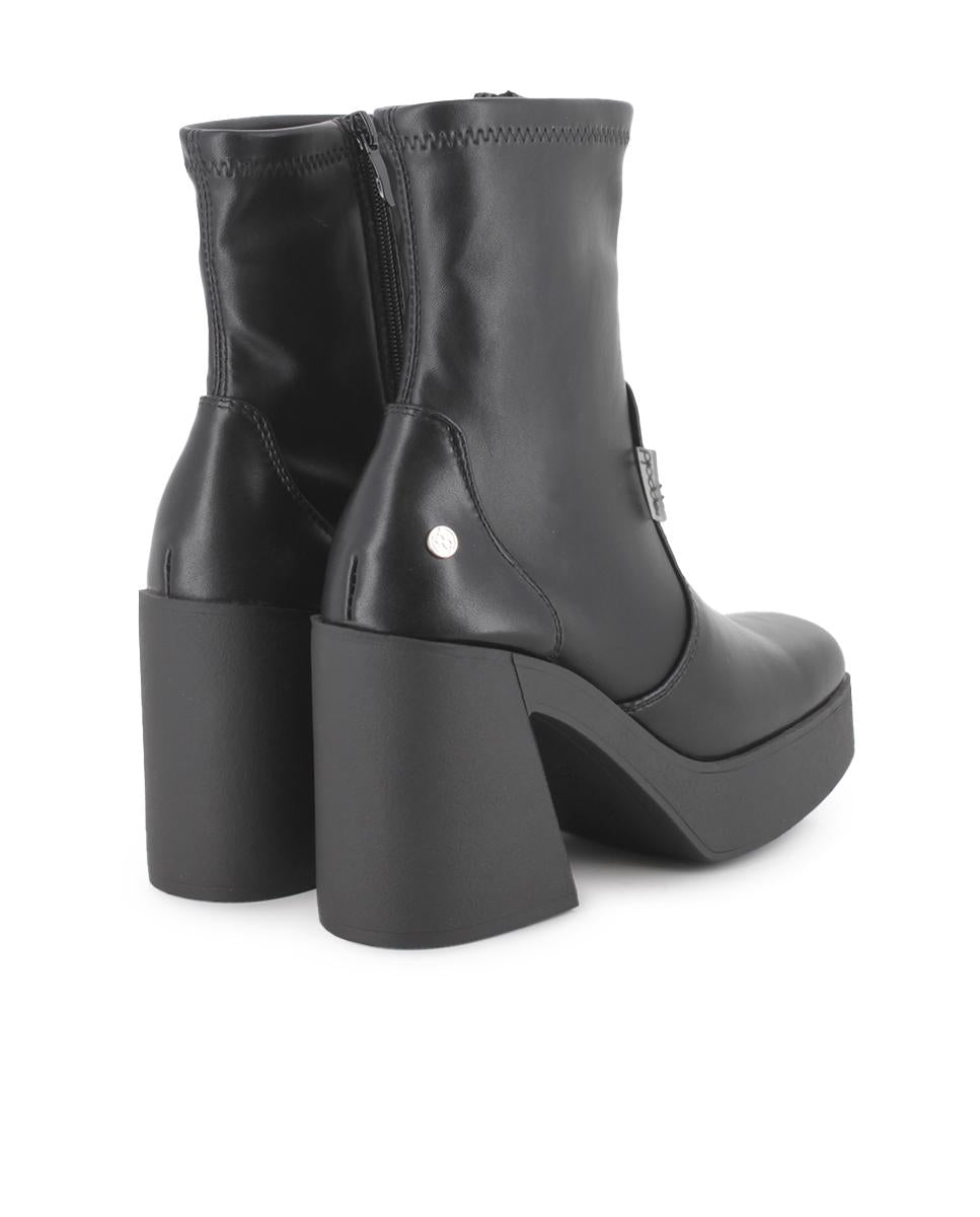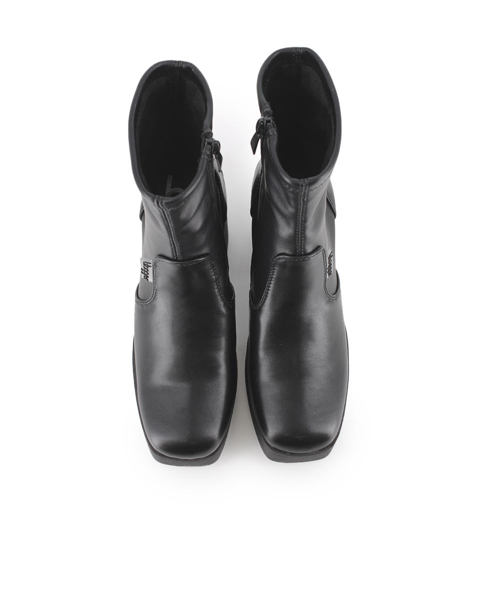 Botines negros en piel sintética con tacón ancho de 10 cm, ideales para un look sofisticado. Caña de 16,5 cm y cierre de cremallera lateral para mayor comodidad y ajuste. Forro interior textil y plantilla sintética que ofrecen confort durante todo el día. Perfectos para mujeres jóvenes que buscan elegancia y estilo en su calzado diario.