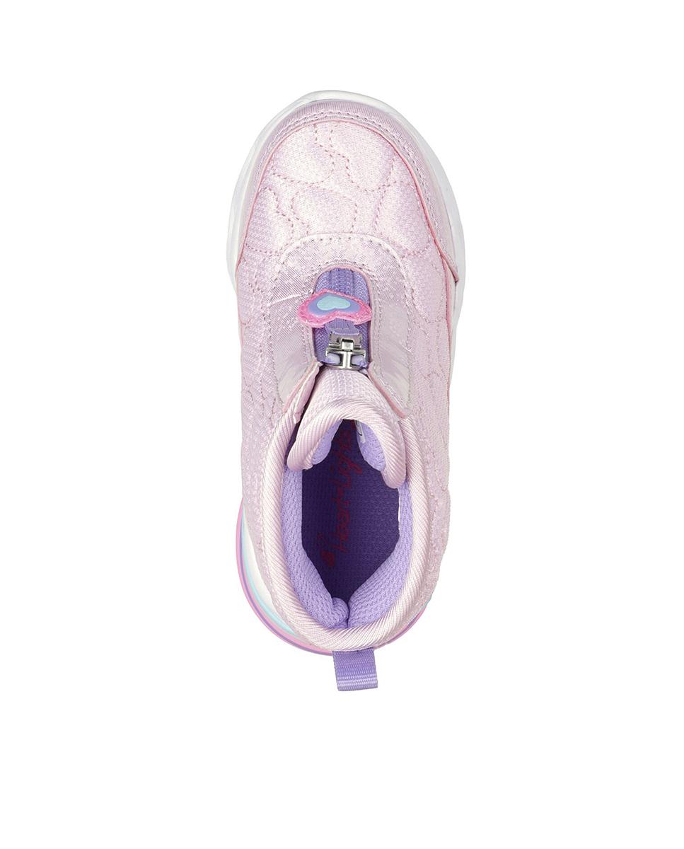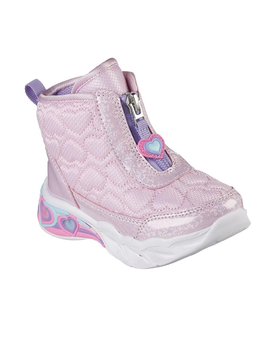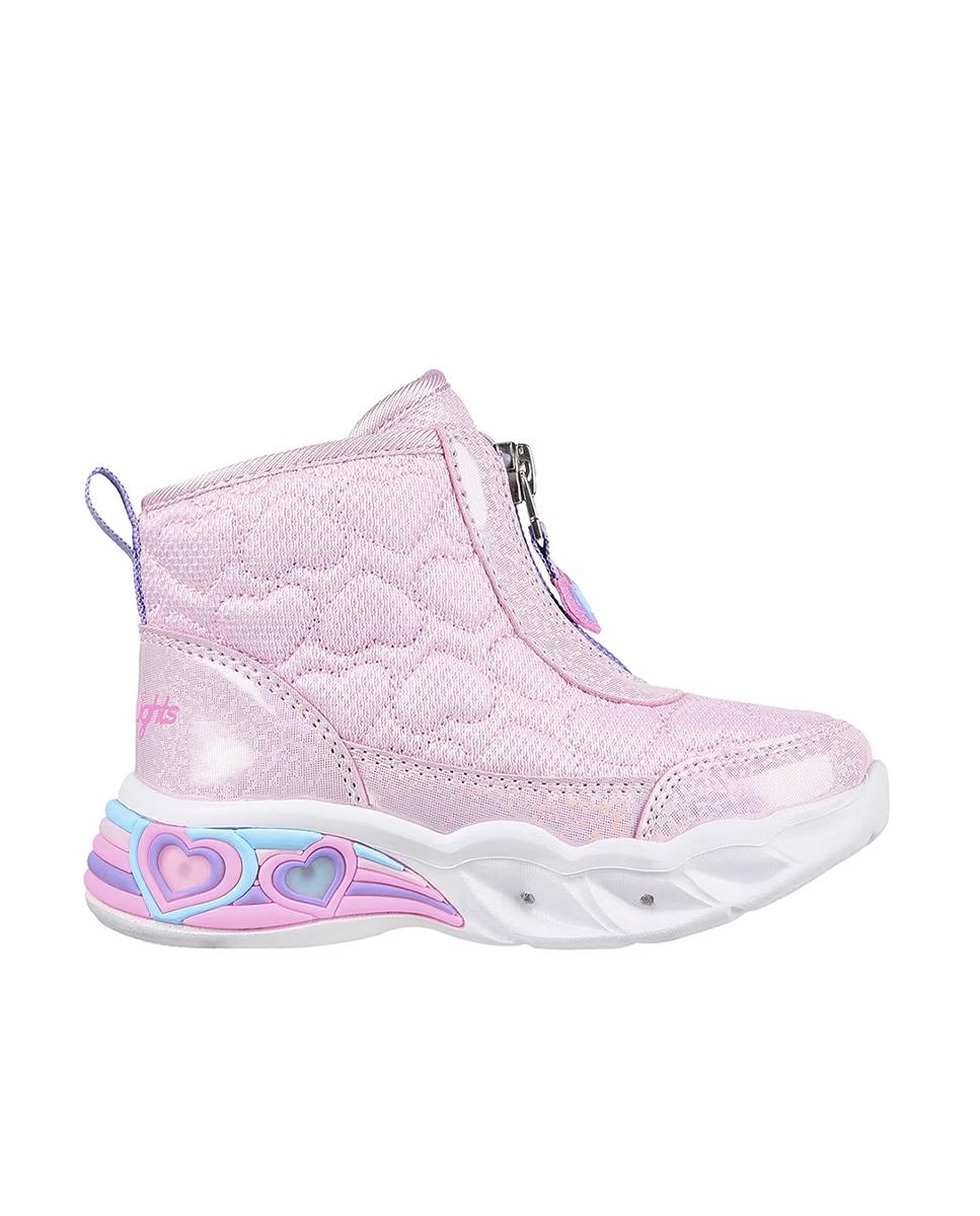 Botines Skechers para niñas de hasta 4 años en material sintético rosa con grabados de corazones y detalles en purpurina. Cuentan con una divertida entresuela de goma con luces y corazones multicolor. El cierre con cremallera frontal facilita el calce. Incorporan plantilla de espuma acolchada para mayor comodidad en cada paso.