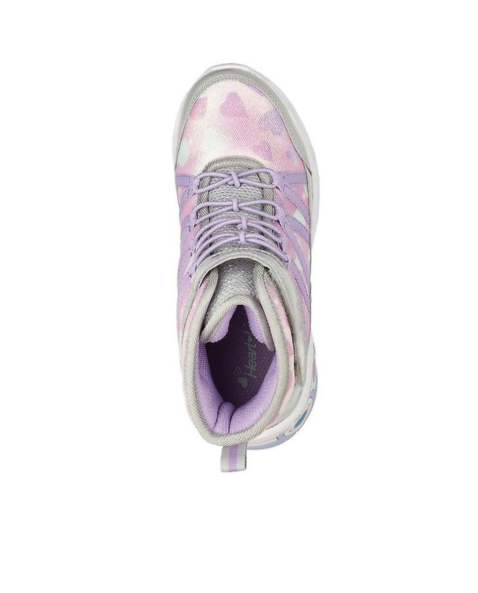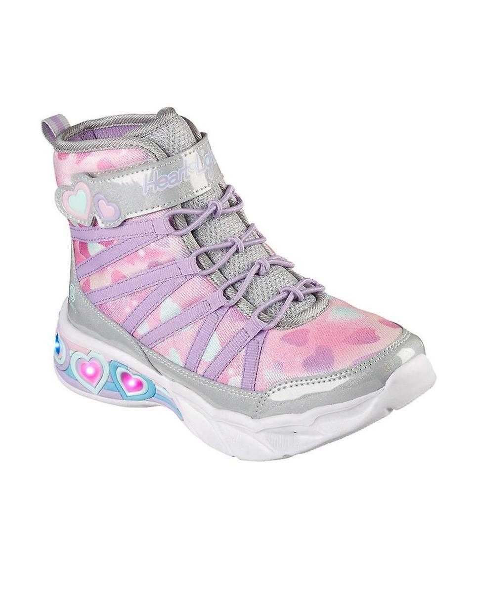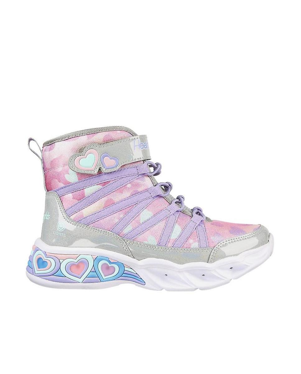 Botines para niñas de 4 a 10 años en material sintético y textil multicolor con estampado de corazones. Cuentan con cordones elásticos, suela de goma con luces y detalles en forma de corazón. Plantilla de espuma para mayor comodidad, caña de 15 cm y altura de 3 cm. Un diseño divertido y cómodo para cada paso.