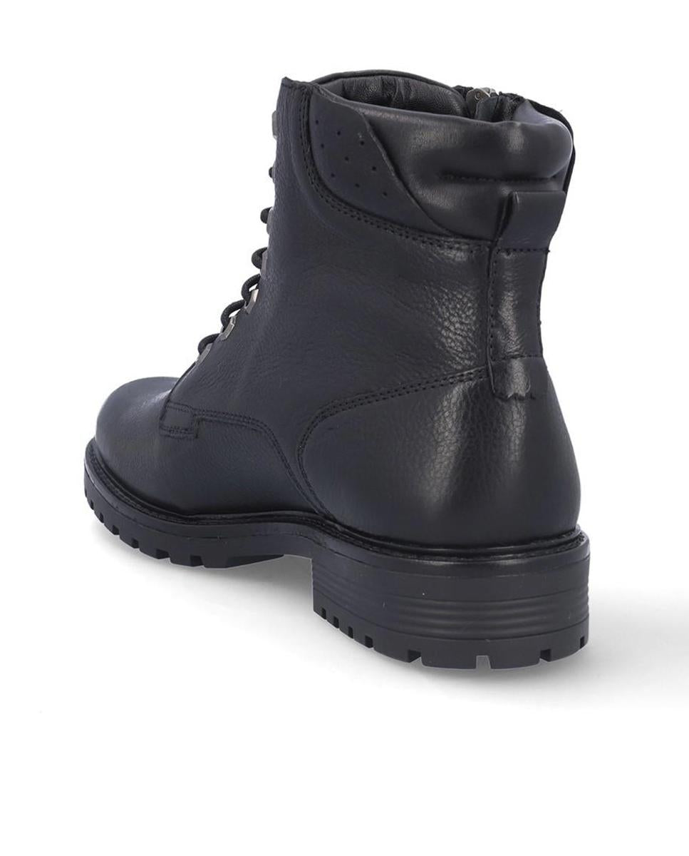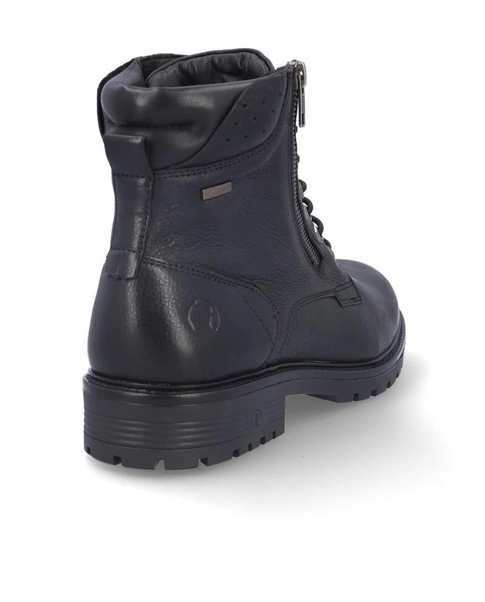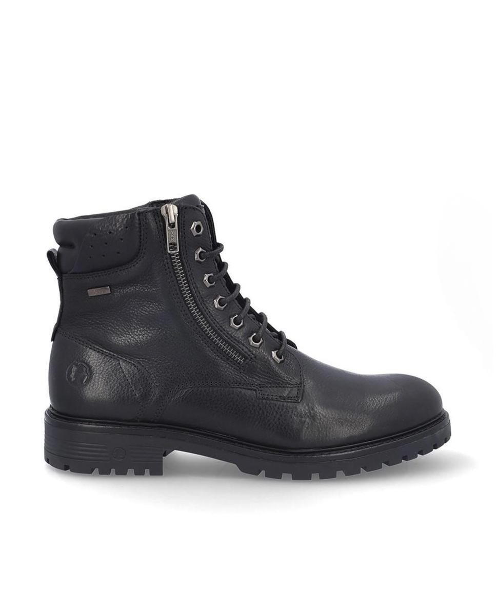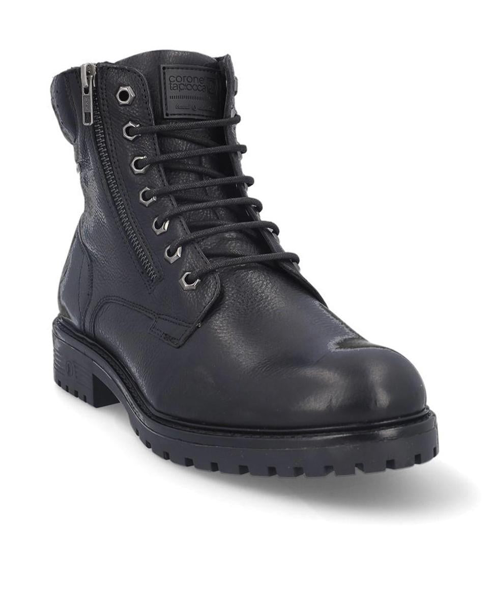 Botines para hombre de Coronel Tapiocca en piel negra con membrana impermeable. Cierre de cordones y cremallera lateral exterior. Forro textil con detalle de piel, plantilla textil extraíble termoconformada. Caña de 14 cm, suela con tacón de 4 cm y plataforma de 2 cm. Fabricados en España para un calzado resistente y cómodo.