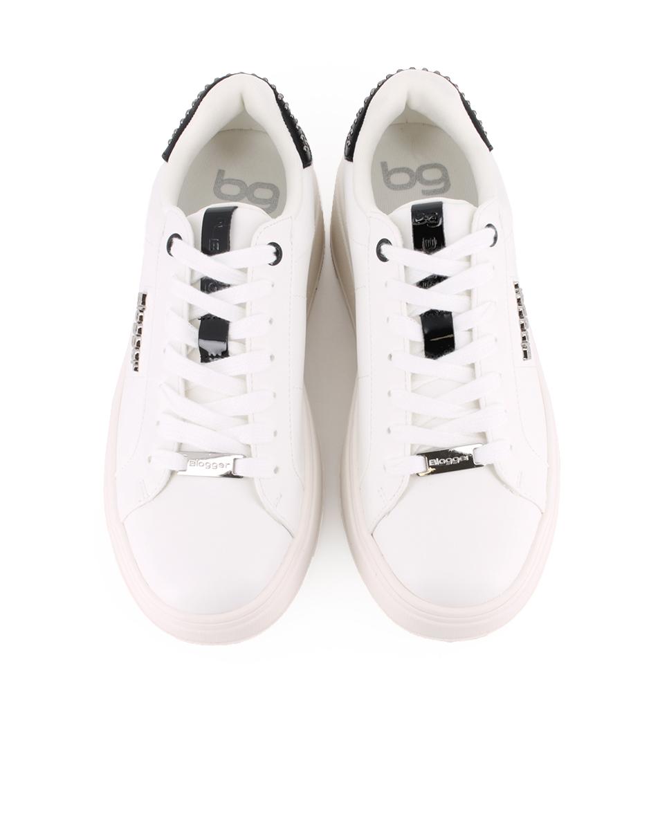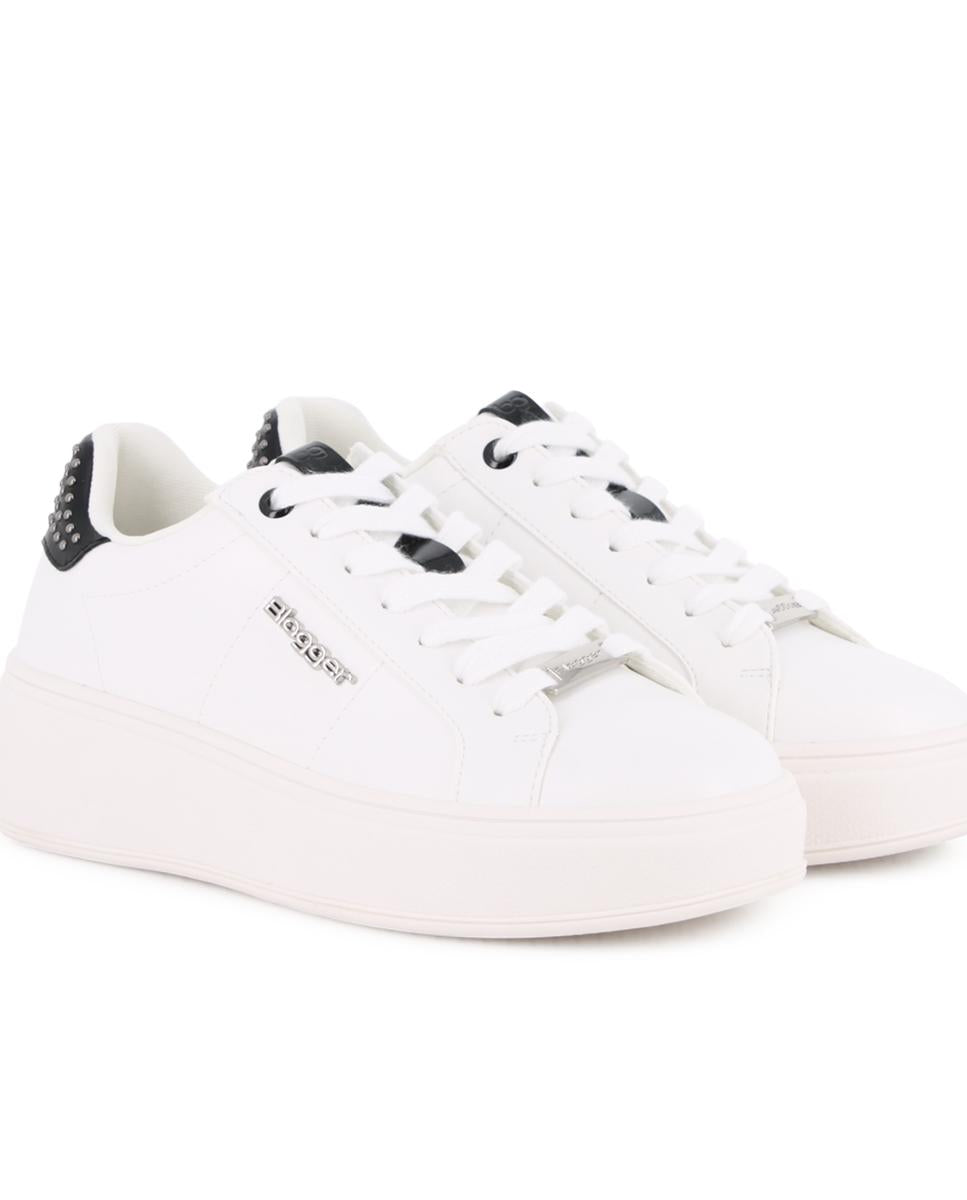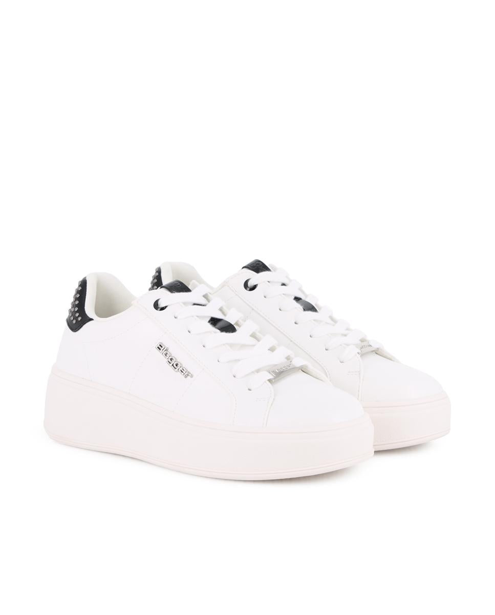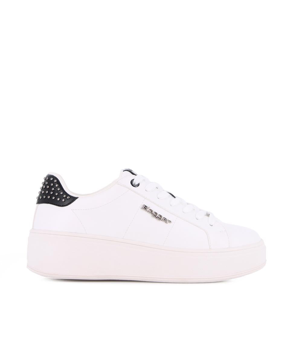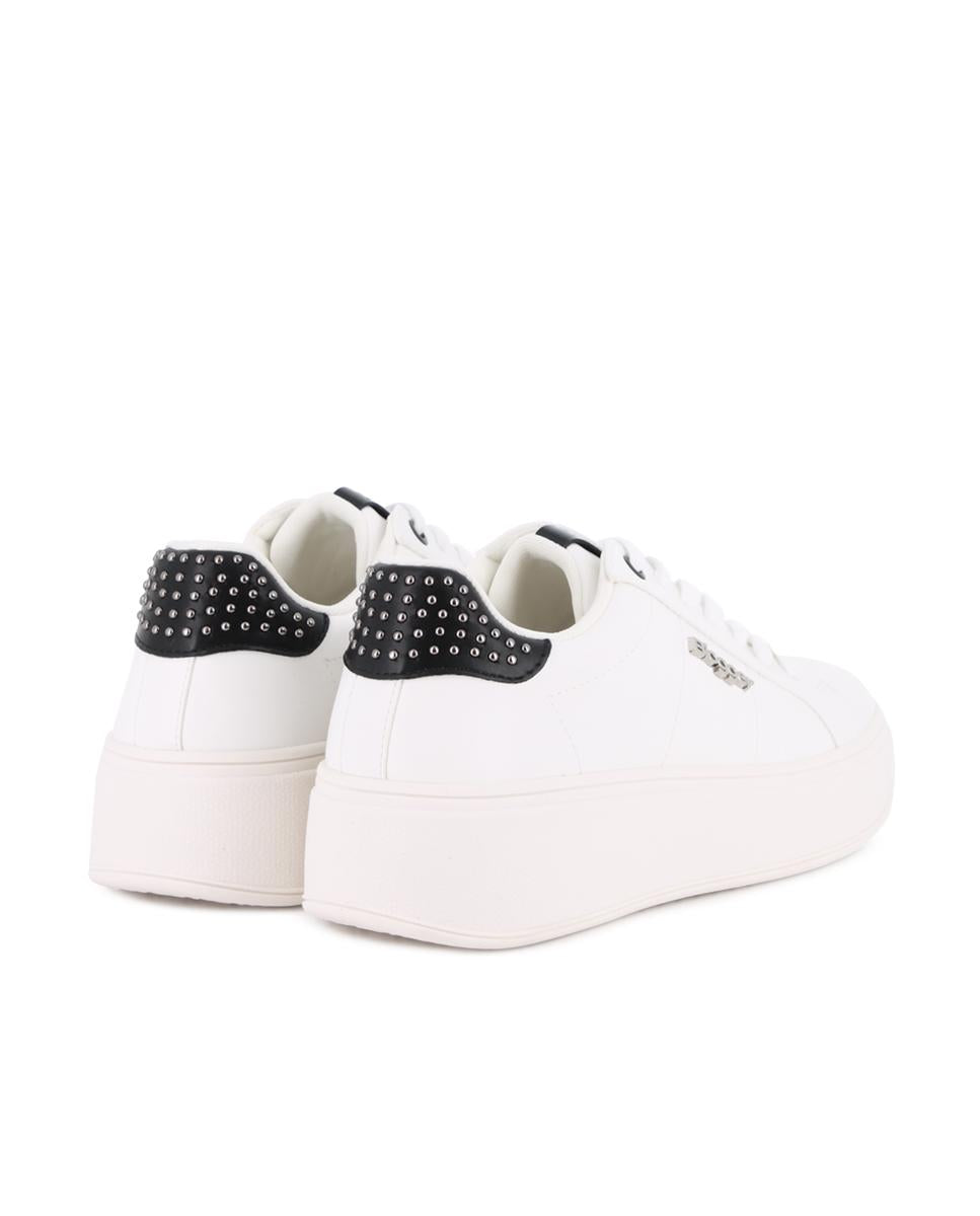 Zapatillas clásicas en material sintético color blanco con punta redonda y detalles en negro y tachuelas que aportan un toque elegante. Cuentan con plataforma de 4 cm, forro interior en sintético y plantilla acolchada en textil, ofreciendo comodidad y estilo en cada paso. Perfectas para un look casual con un toque sofisticado.