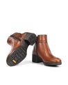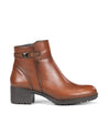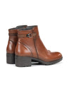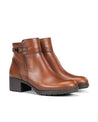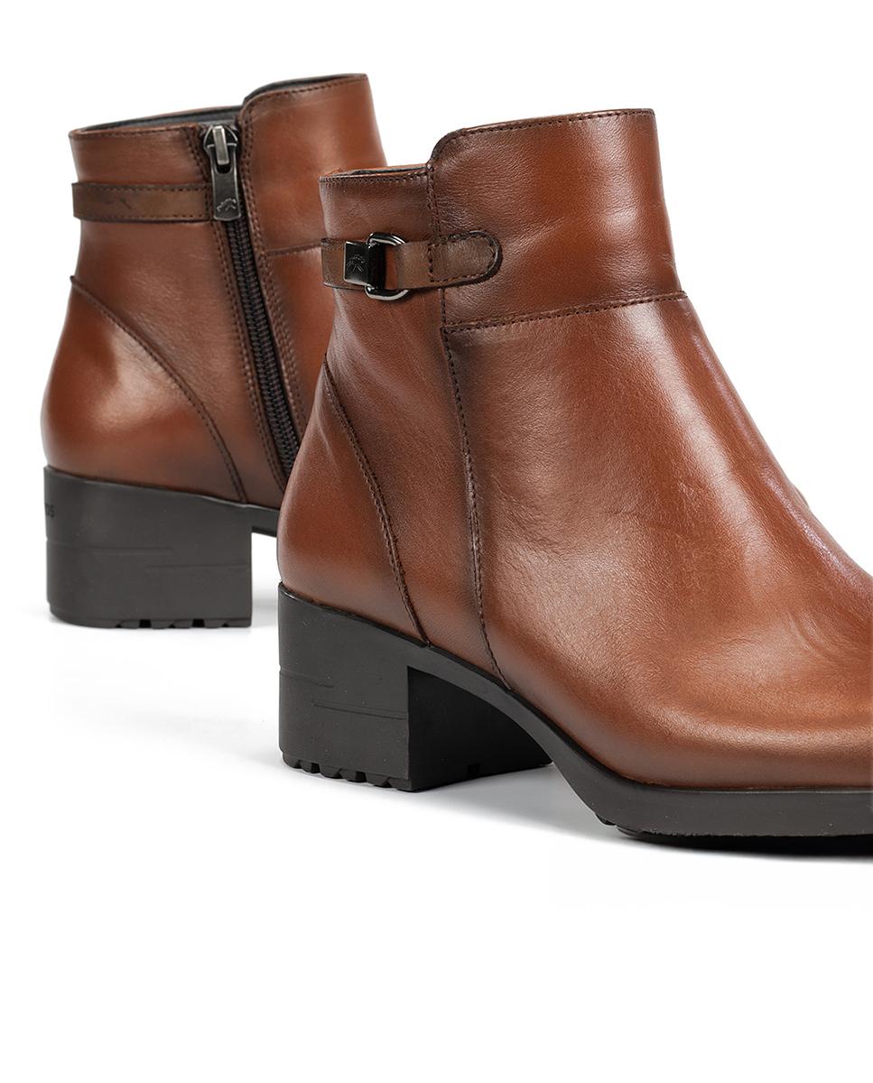 Botines para mujer en piel marrón con punta redonda y un diseño elegante y atemporal. Destacan por la tira con herraje plateado en la parte superior de la caña, que añade un toque distintivo. Cuentan con cierre de cremallera y tacón ancho de 5 cm, ideal para aportar altura y comodidad en el día a día.