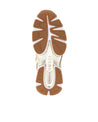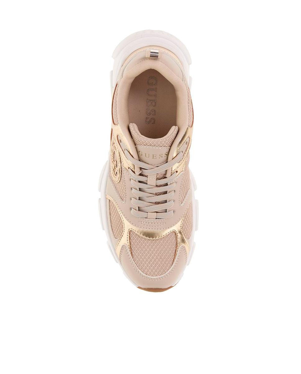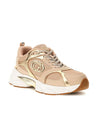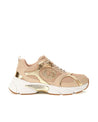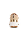 Zapatillas casuales para mujer de estilo runner en tonos beige, con material sintético, textil y revestimientos dorados. Detalles laminados que aportan un toque brillante y femenino. Diseño de punta redonda, suela de goma resistente y cómoda, y altura de 4,5 cm para estilizar la figura. Cierre con cordones para un ajuste seguro y práctico.