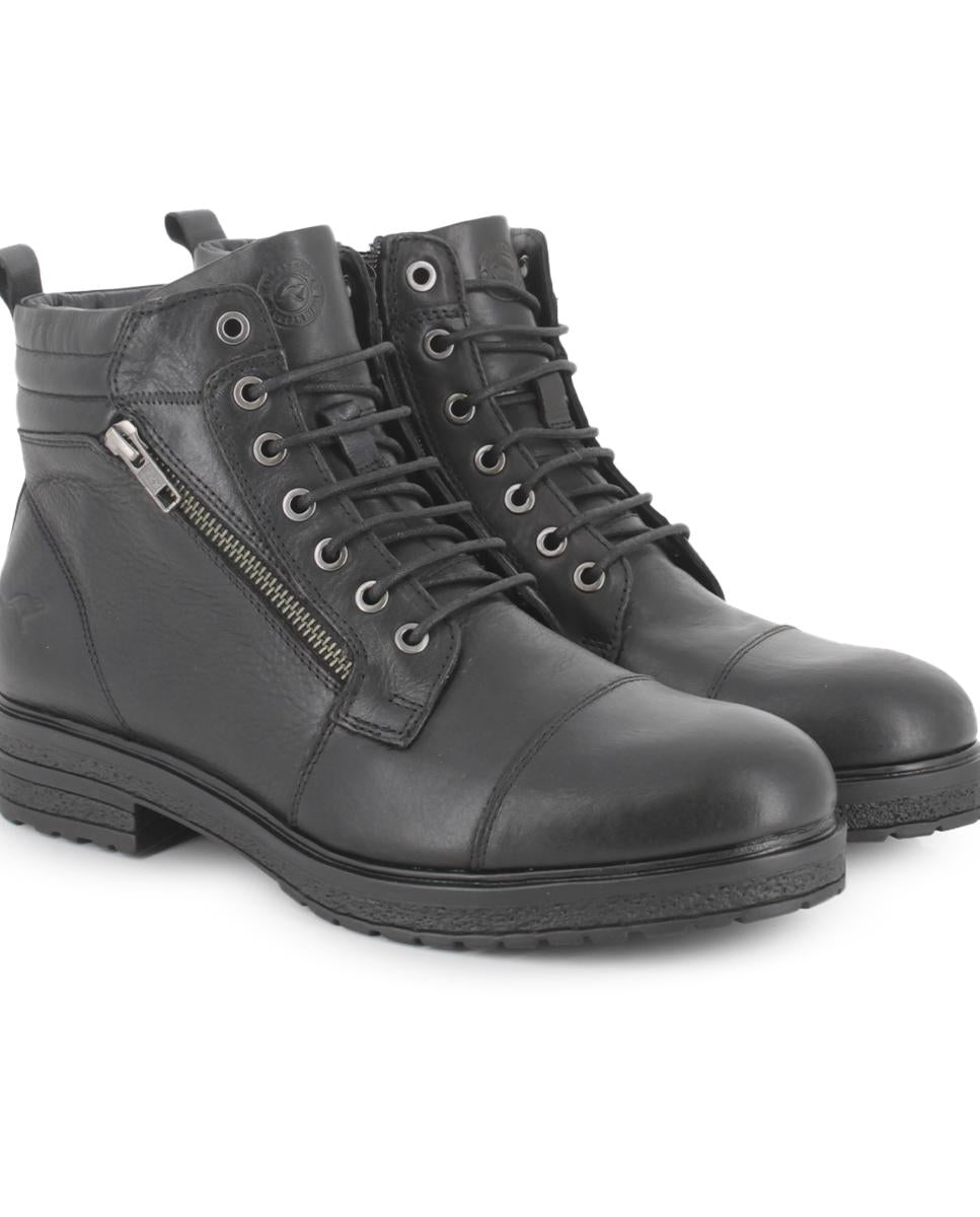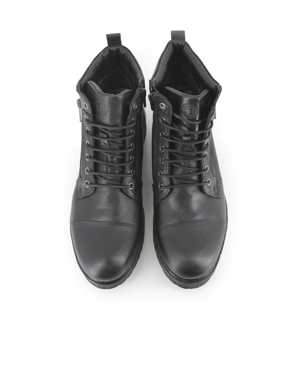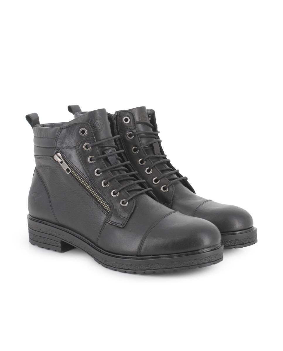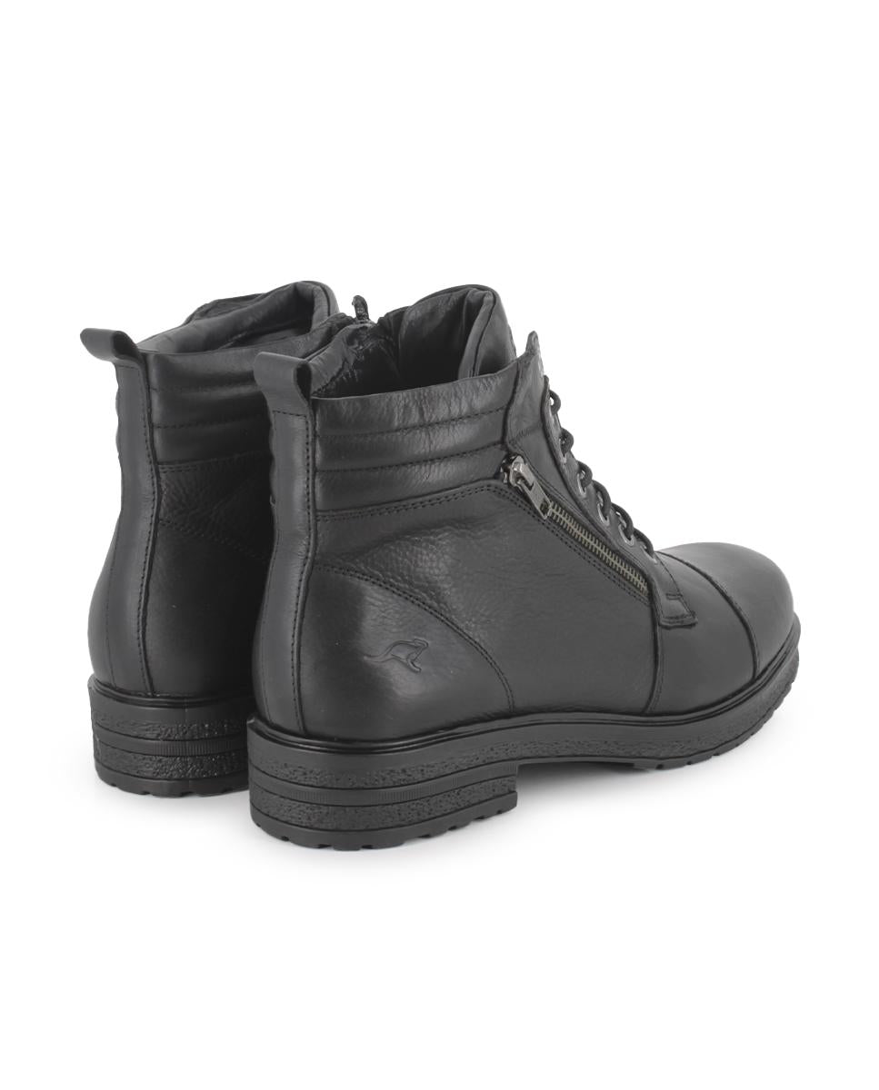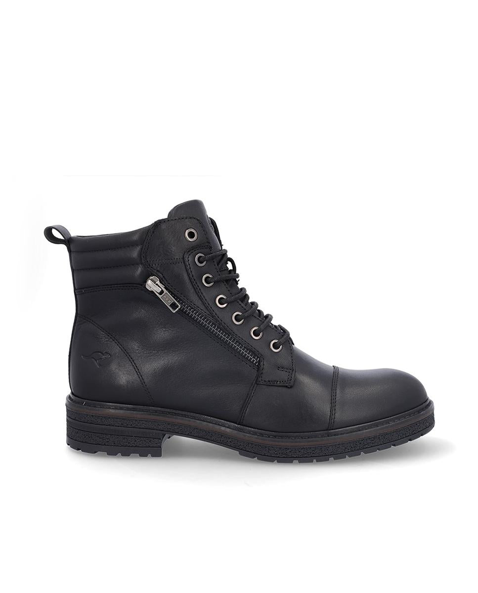 Botines para hombre de Kangaroos confeccionados en piel color negro, con cordones y cremalleras interior y exterior que facilitan la puesta y retirada. Incorporan forro textil con vista de piel y plantilla textil extraíble termoconformada para mayor confort. Con caña de 15 cm y suela robusta con tacón de 4 cm y plataforma de 2 cm, ofrecen estilo, comodidad y sujeción diaria.