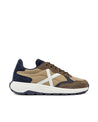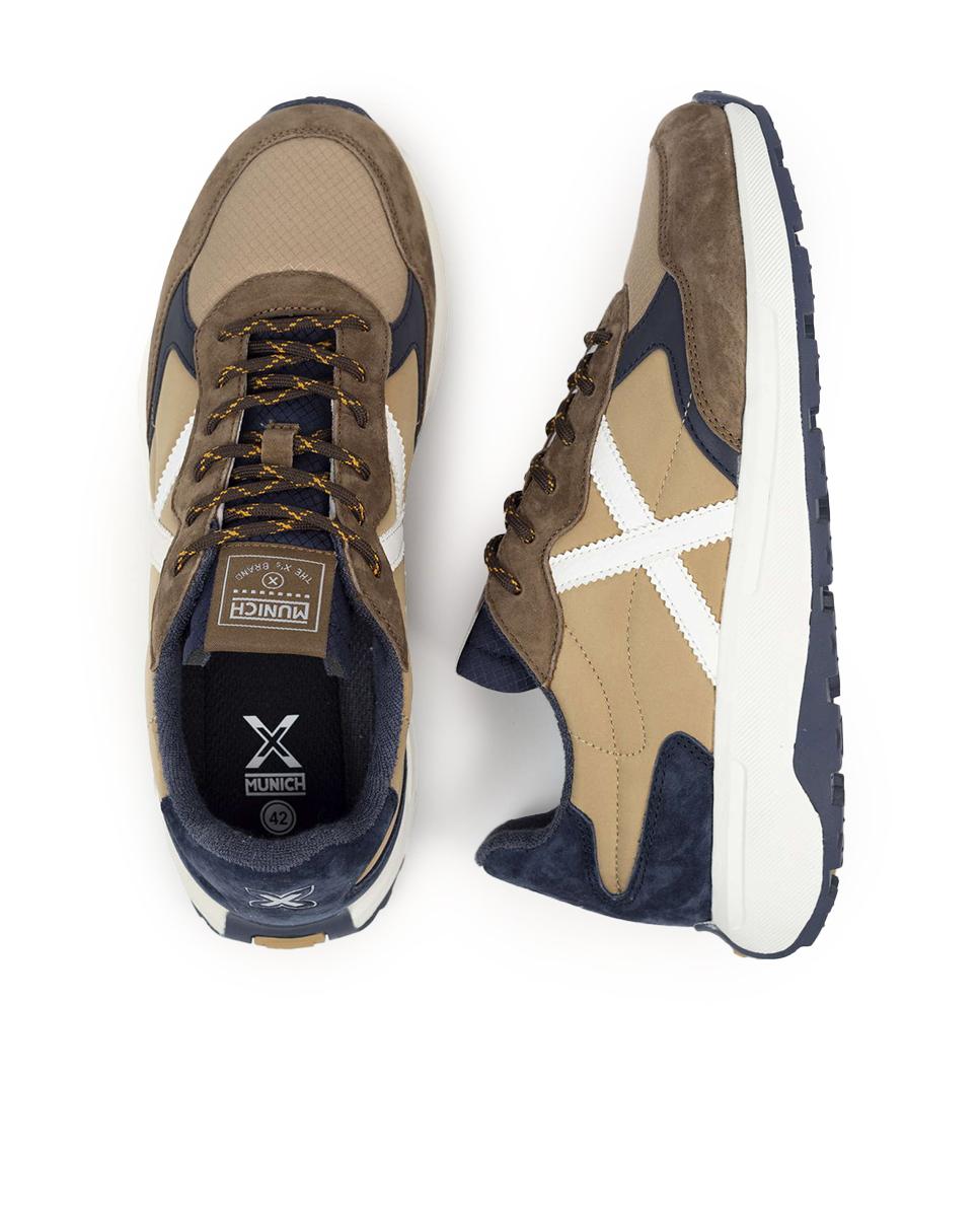 Zapatillas casuales de Munich para hombre con un diseño audaz y vibrante. Combinan serraje, piel sintética y textil en azul marino, beige y marrón. Suela dentada de goma de 4 cm que aporta tracción y comodidad. Cierre con cordones. Ideales para quienes buscan estilo, personalidad y confort en un calzado urbano con mucha actitud.
