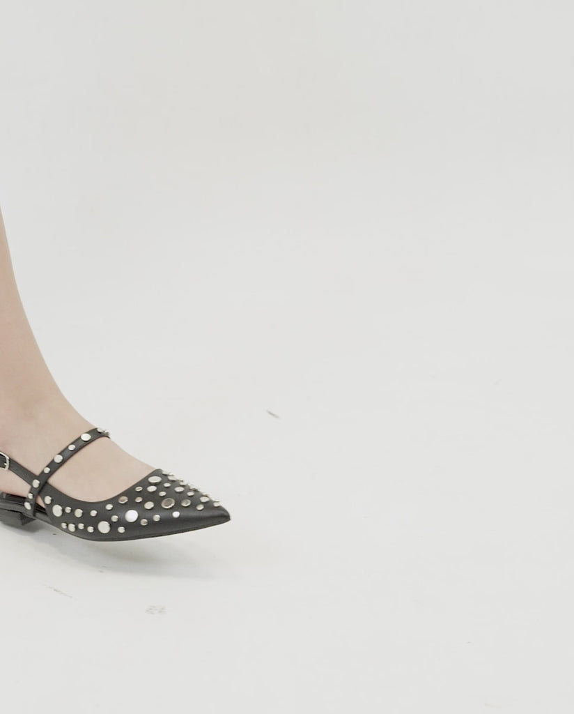 Bailarinas destalonadas en piel sintética color negro con elegante terminado en punta. Decoradas con tachuelas metalizadas en la parte superior para un toque moderno. Cuentan con piso plano de 1 cm para confort diario, tira en el empeine con elástico y cierre de hebilla para ajuste perfecto. Forro sintético y plantilla en piel.
