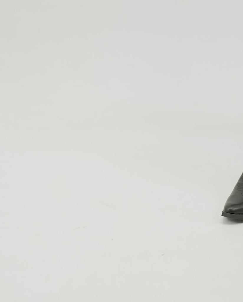 Botines en piel lisa color negro con delicados bordados de flores que aportan un toque femenino y elegante. Tacón ancho de 5 cm para comodidad y estilo. Caña alta de 30 cm con cierre lateral de cremallera, forro interior textil y plantilla de piel. Perfectos para looks primaverales y sofisticados.