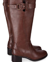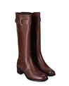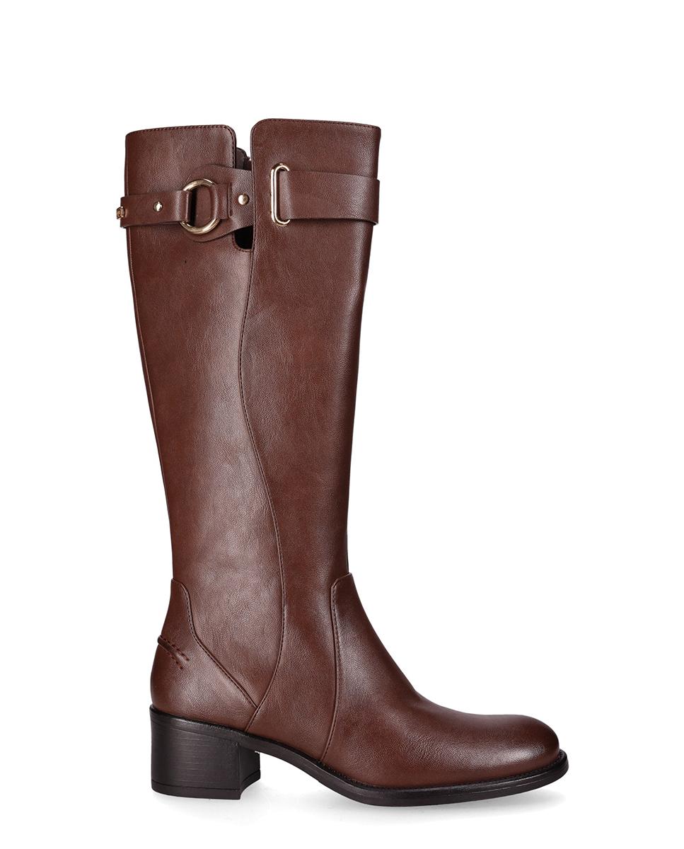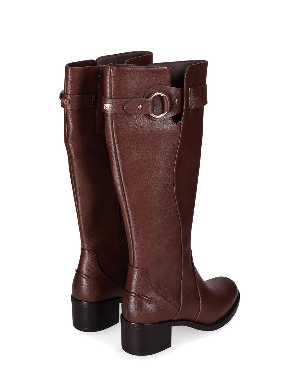 Botas de caña alta para mujer de Chika10, confeccionadas en piel sintética color marrón. Con punta redonda y tacón ancho de 5 cm, ofrecen comodidad y estilo para el día a día. Un detalle decorativo en la parte superior realza el diseño, convirtiéndolas en una opción versátil y con personalidad, más allá de un básico de armario.