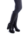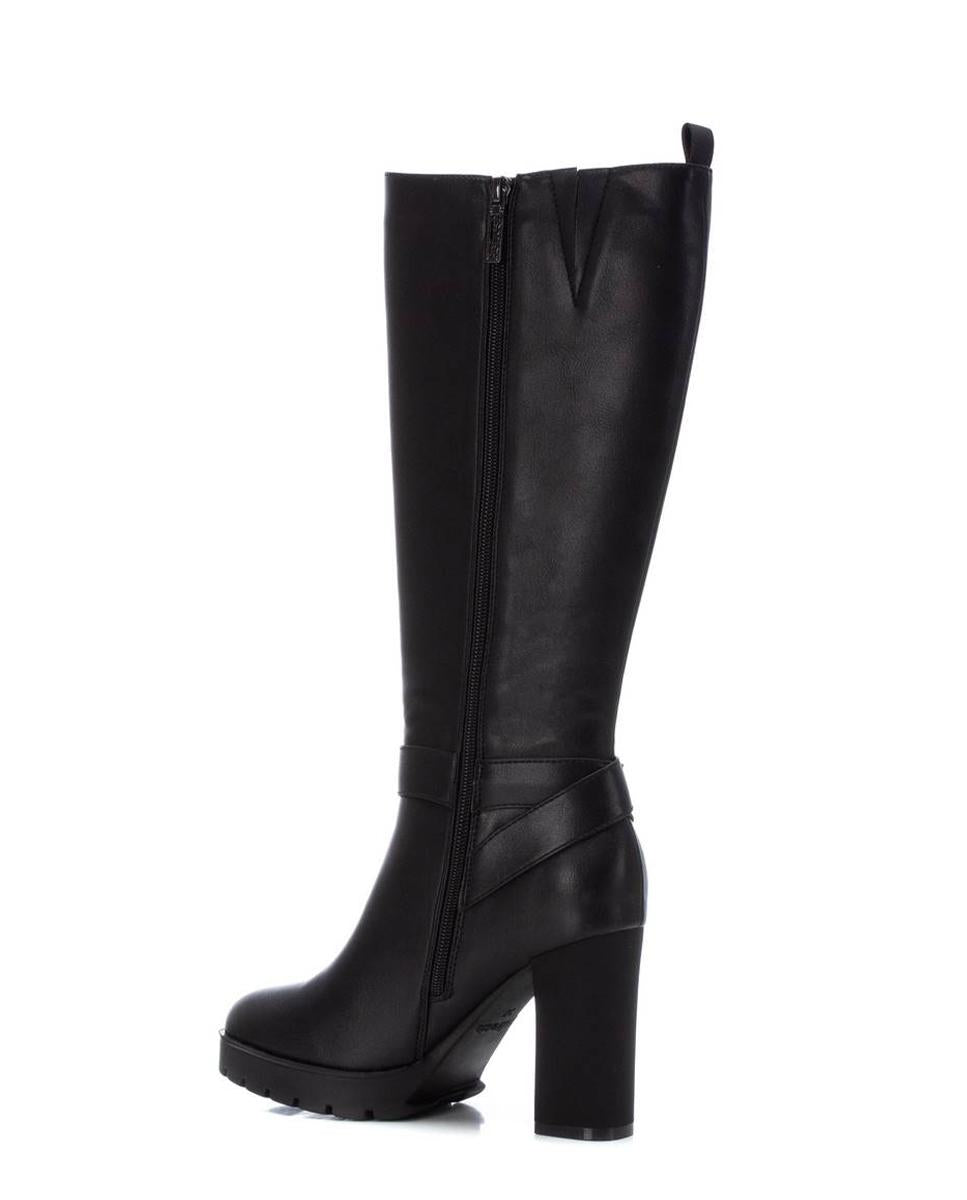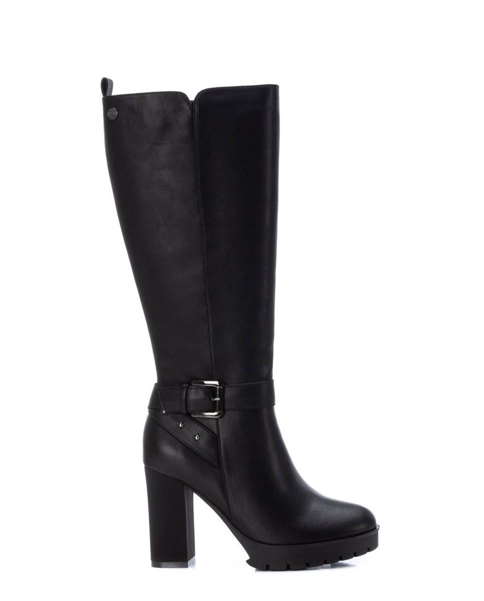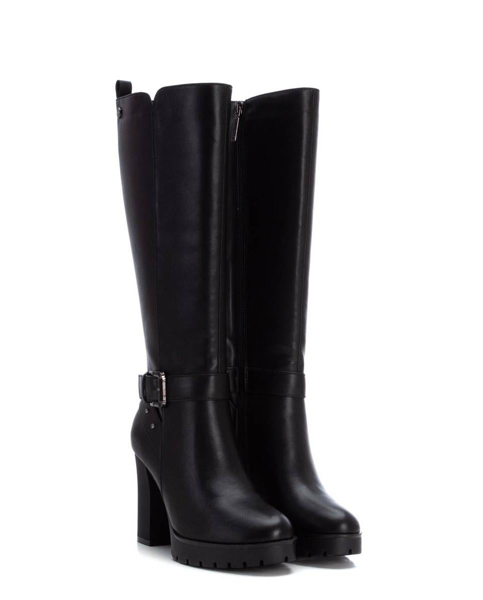 Estas botas de caña alta de Refresh, con 34 cm de altura, están confeccionadas en piel sintética negra con punta redonda y decoradas con hebilla y tachuelas metalizadas. Su tacón ancho de 10 cm y plataforma de 2 cm brindan altura y comodidad. Con cierre de cremallera y certificado vegano PETA, combinan estilo audaz y conciencia animal.