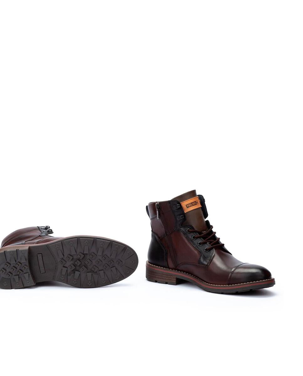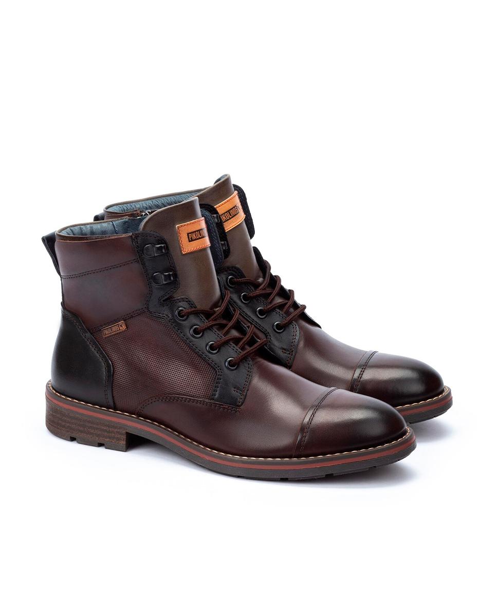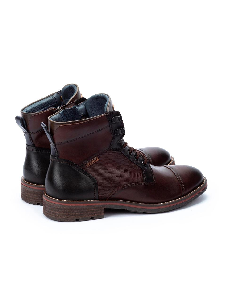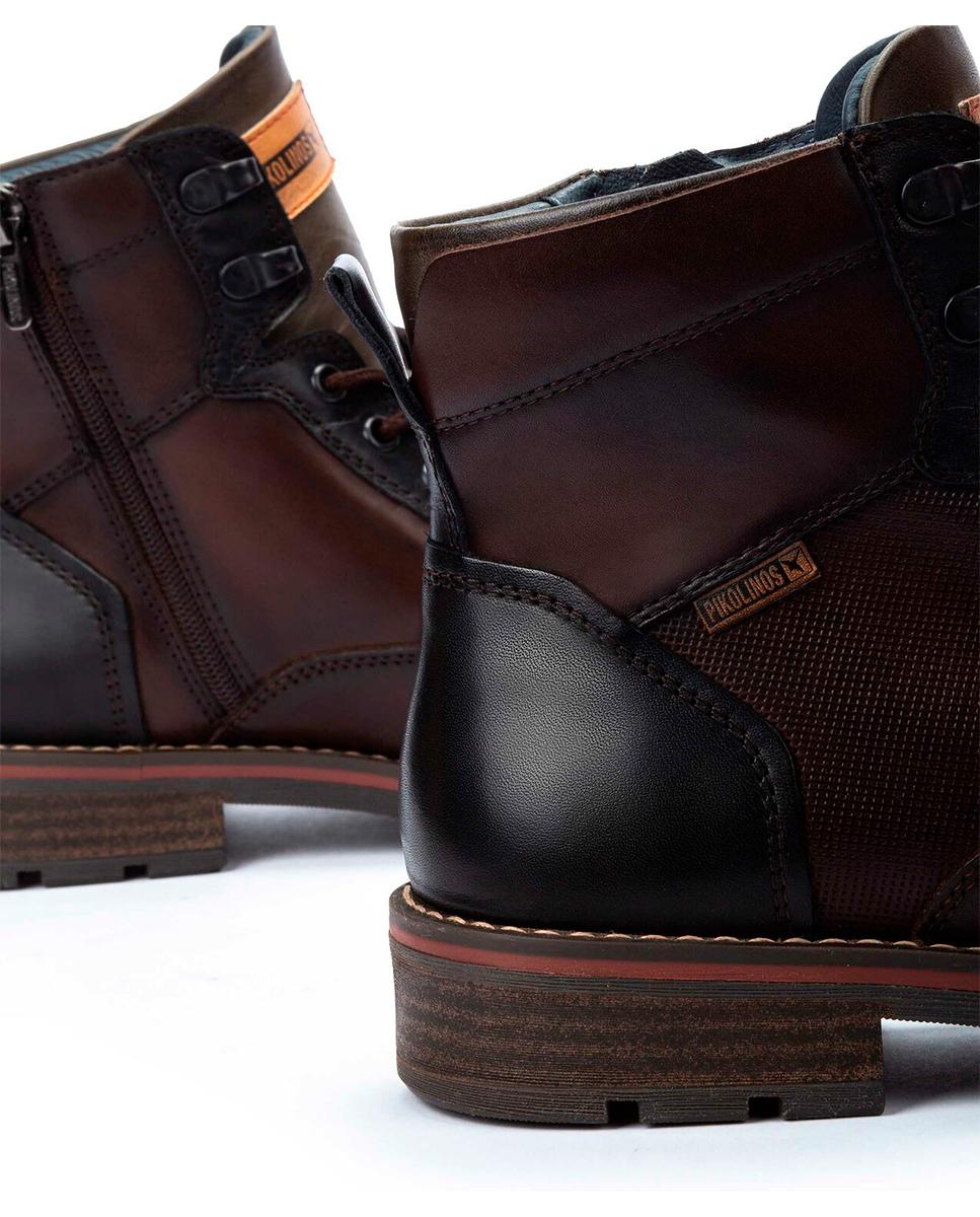 Estos botines Pikolinos para hombre en marrón intenso combinan estilo y funcionalidad. Con piel de alta calidad y piezas sobrepuestas en tonos oscuros, destacan por sus perforaciones laterales que aportan sofisticación. Cuentan con punta redonda, suela sintética de 2 cm, cierre en cremallera y cordones ajustables. Plantilla extraíble y forro en piel y textil garantizan confort y ajuste personalizado.