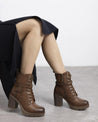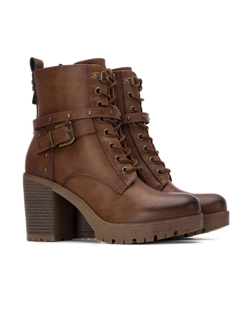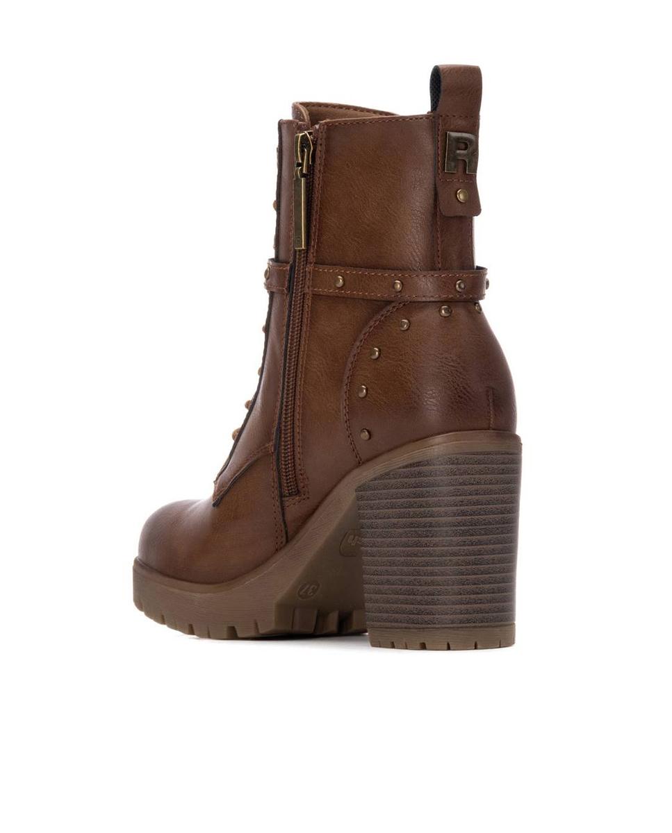 Botines de tacón para mujer de la marca Refresh, fabricados en piel sintética marrón. Presentan un diseño moderno con cintas y correas decorativas al tobillo. Incluyen cierre con cremallera interior y cordones ajustables para un mejor ajuste, además de tirador trasero para facilitar la puesta. Tacón ancho de 9 cm con suela antideslizante y plantilla extraíble. Certificados como 100% veganos.