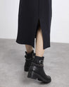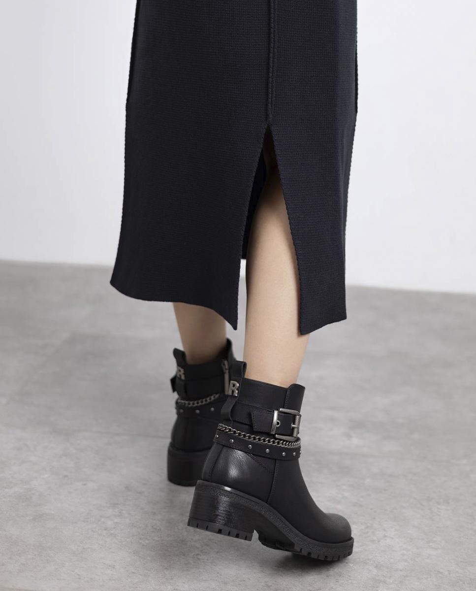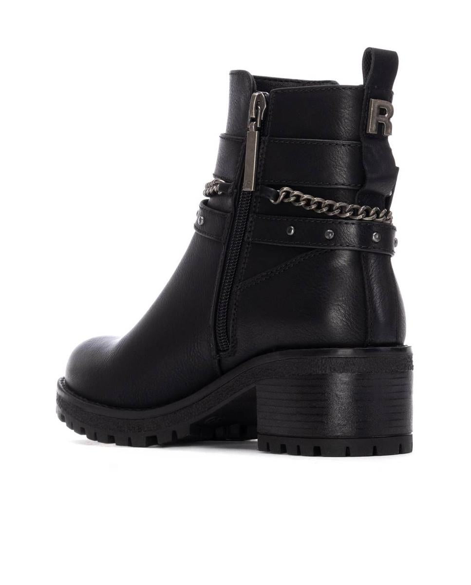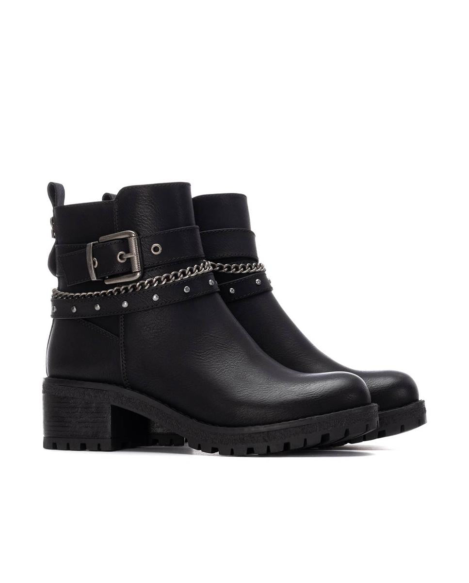Botines de tacón para mujer de la marca Refresh, fabricados en piel sintética negra. Presentan un diseño con cintas y cadenas decorativas al tobillo que aportan un toque moderno y distintivo. Incorporan cierre con cremallera interior y tirador trasero para mayor comodidad. Tacón ancho de 5 cm, suela de goma antideslizante y plantilla extraíble. Certificados como 100% veganos.