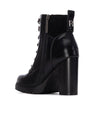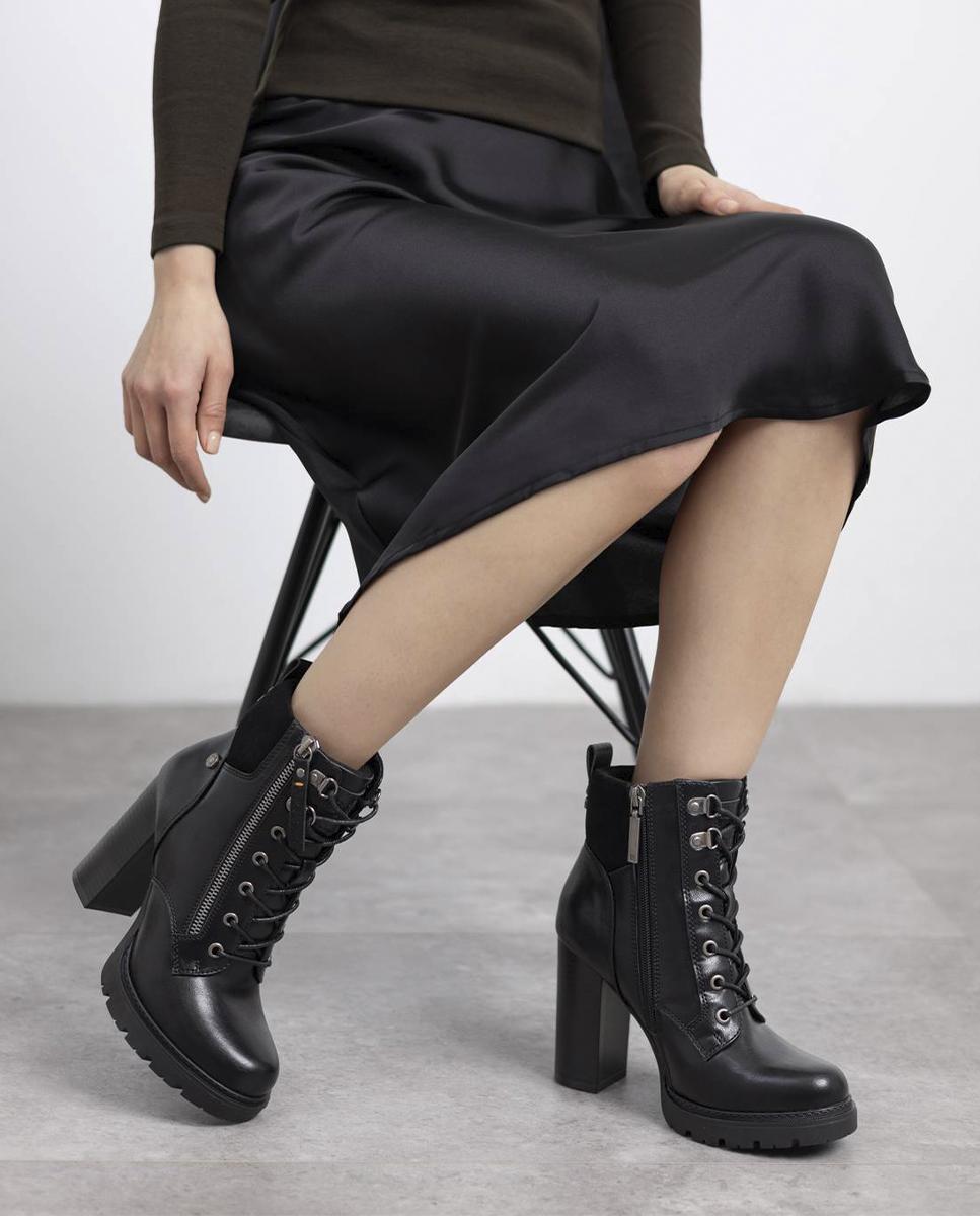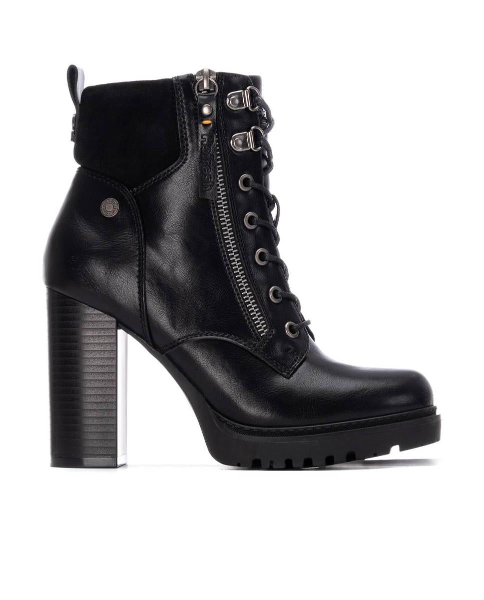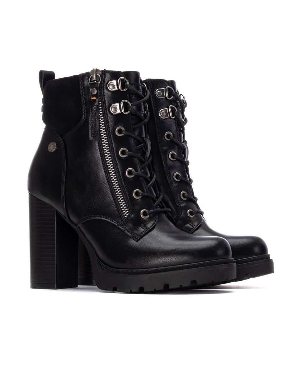 Botines de tacón para mujer de la marca Refresh en piel sintética negra, con collarín textil para mayor comodidad. Cierre con cremallera interior y cordones ajustables, además de tirador trasero para facilitar el calce. Tacón ancho de 10 cm con plataforma antideslizante para mayor seguridad y confort. Modelo certificado 100% vegano por la Organización Mundial de los Derechos de los Animales.