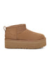 Botines australianos de UGG en ante beige que combinan elegancia, calidez y funcionalidad. Su plantilla ecológica con lana reciclada (80%) y lyocell (20%) ofrece confort térmico, mientras que la suela EVA garantiza ligereza y flexibilidad. Con plataforma de 5 cm y caña de 9 cm, incorporan detalles modernos como costuras vistas, trabilla trasera y línea superior asimétrica.