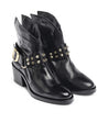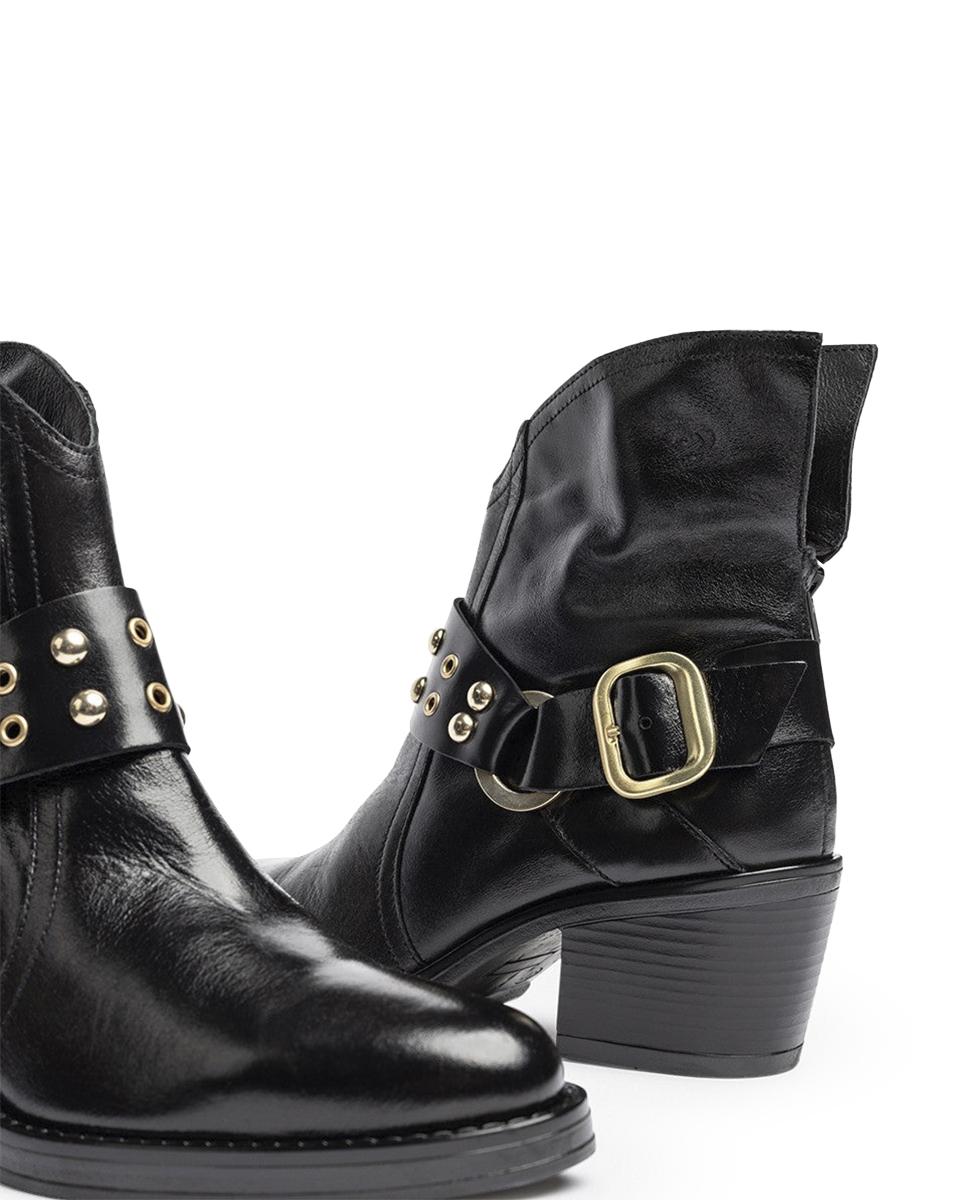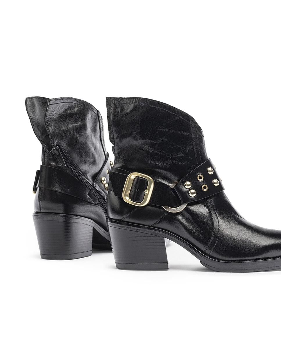 Estos botines de tacón para mujer de Yokono combinan carácter, diseño y calidad en una silueta elegante y versátil. Fabricados en piel de alta calidad color negro con un acabado envejecido, destacan por su correa decorativa con tachuelas y hebilla metálica, punta estilizada y tacón ancho de 6 cm, que aporta comodidad y estilo a cualquier look.