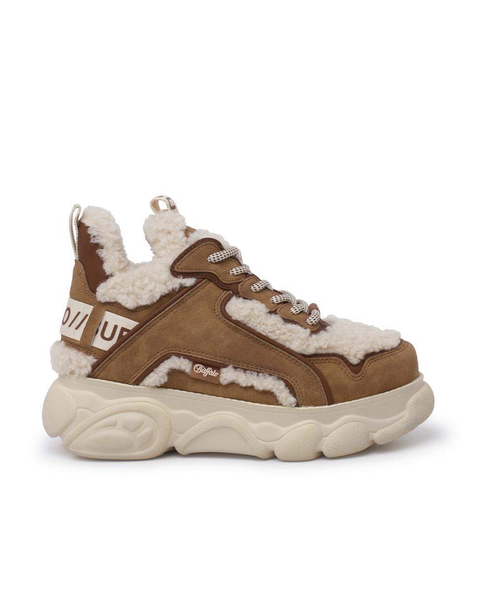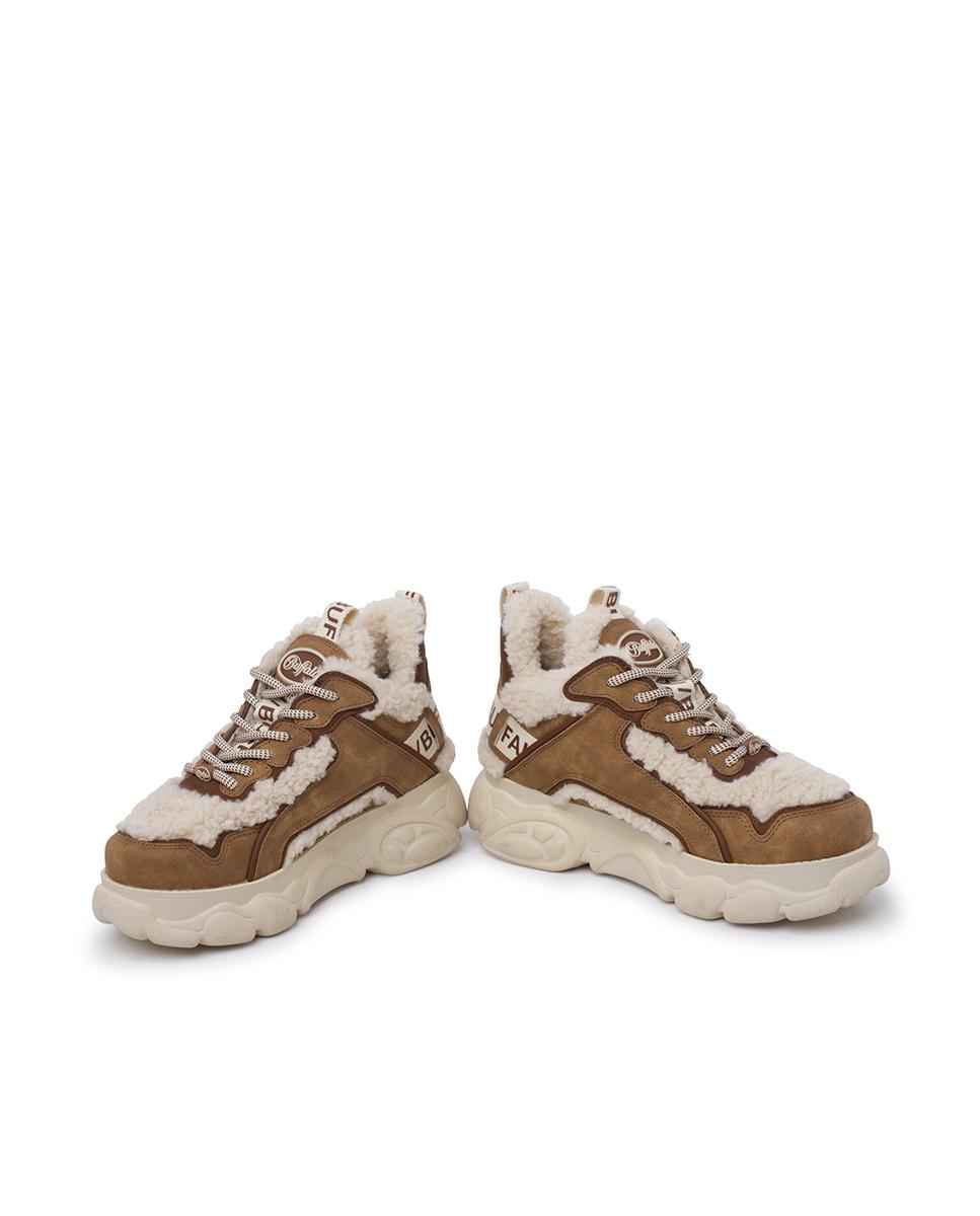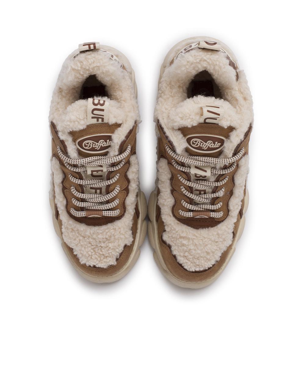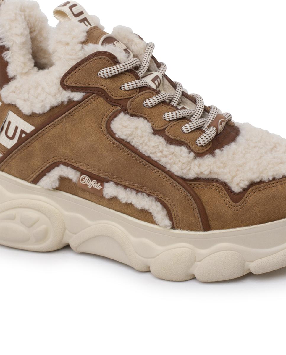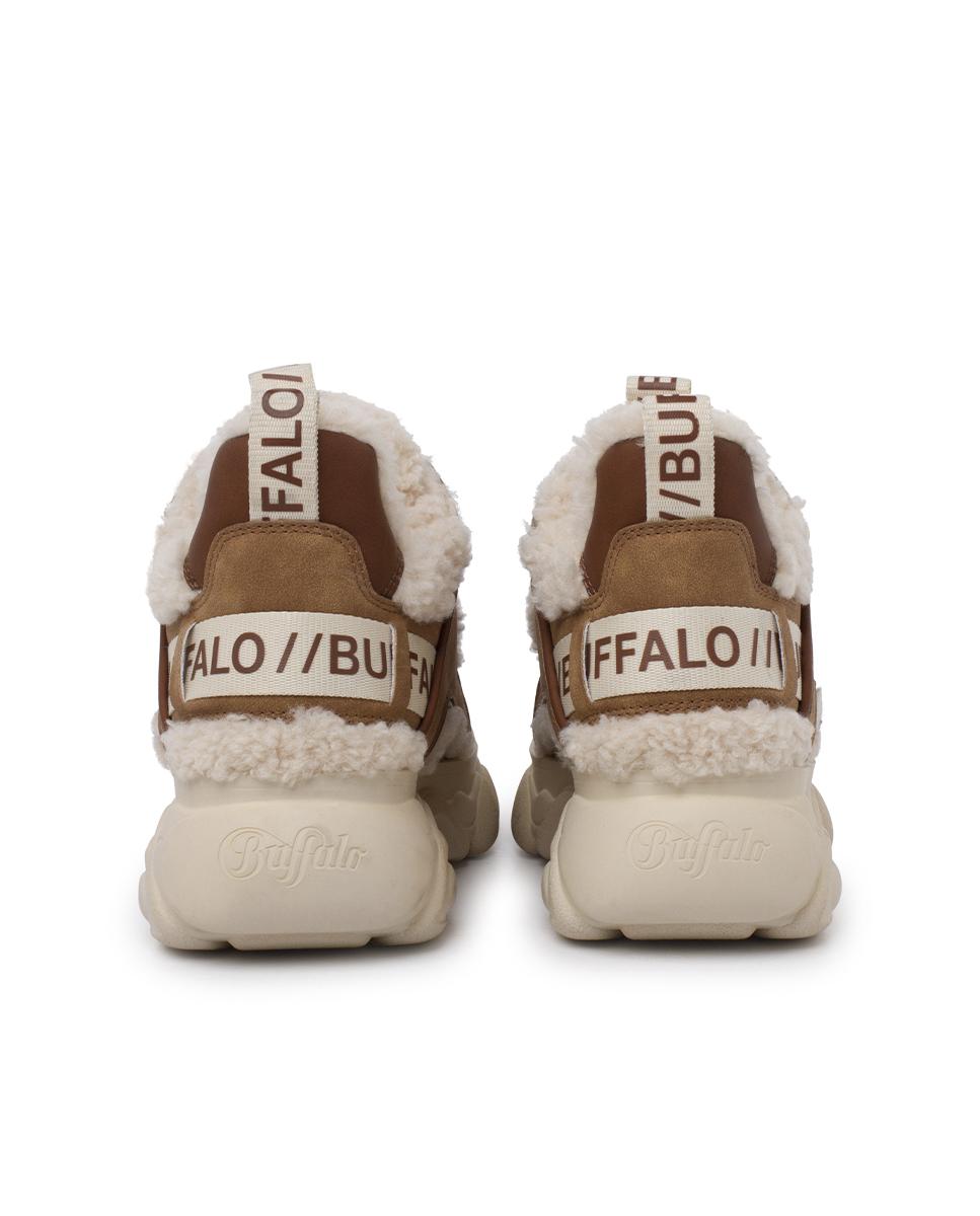 Descubre el equilibrio ideal entre estilo moderno y confort con estas zapatillas de Buffalo. Confeccionadas en serraje y piel de borrego sintéticos en tonos camel y beige, destacan por sus costuras visibles y punta redonda. Cinta con logo, plataforma cincelada de 4?cm y cierre en cordones completan el diseño. Interior y plantilla textil para máxima comodidad.