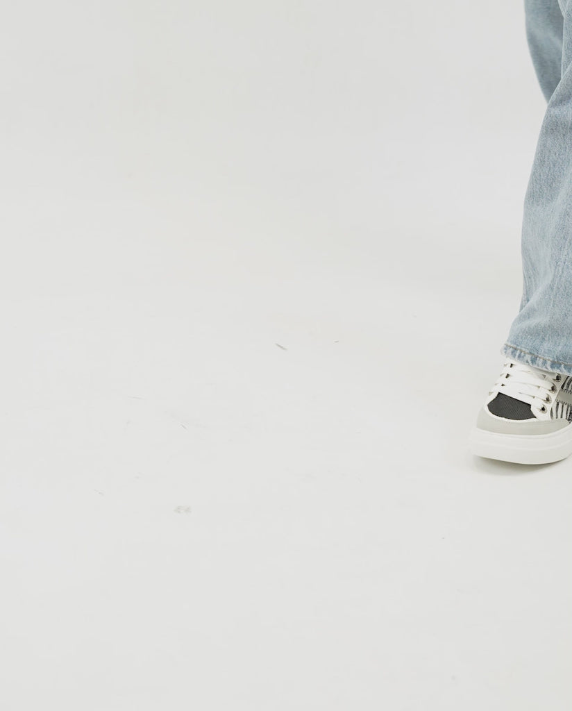Zapatillas en materiales sintéticos que fusionan estilo y personalidad. Presentan una llamativa combinación de blanco y negro con detalles de purpurina plateada y estampado de cebra, además de tachuelas en la parte trasera que realzan su carácter urbano. Piso plano de 3 cm, cierre en cordones, forro interior en textil y plantilla sintética para un confort diario.