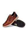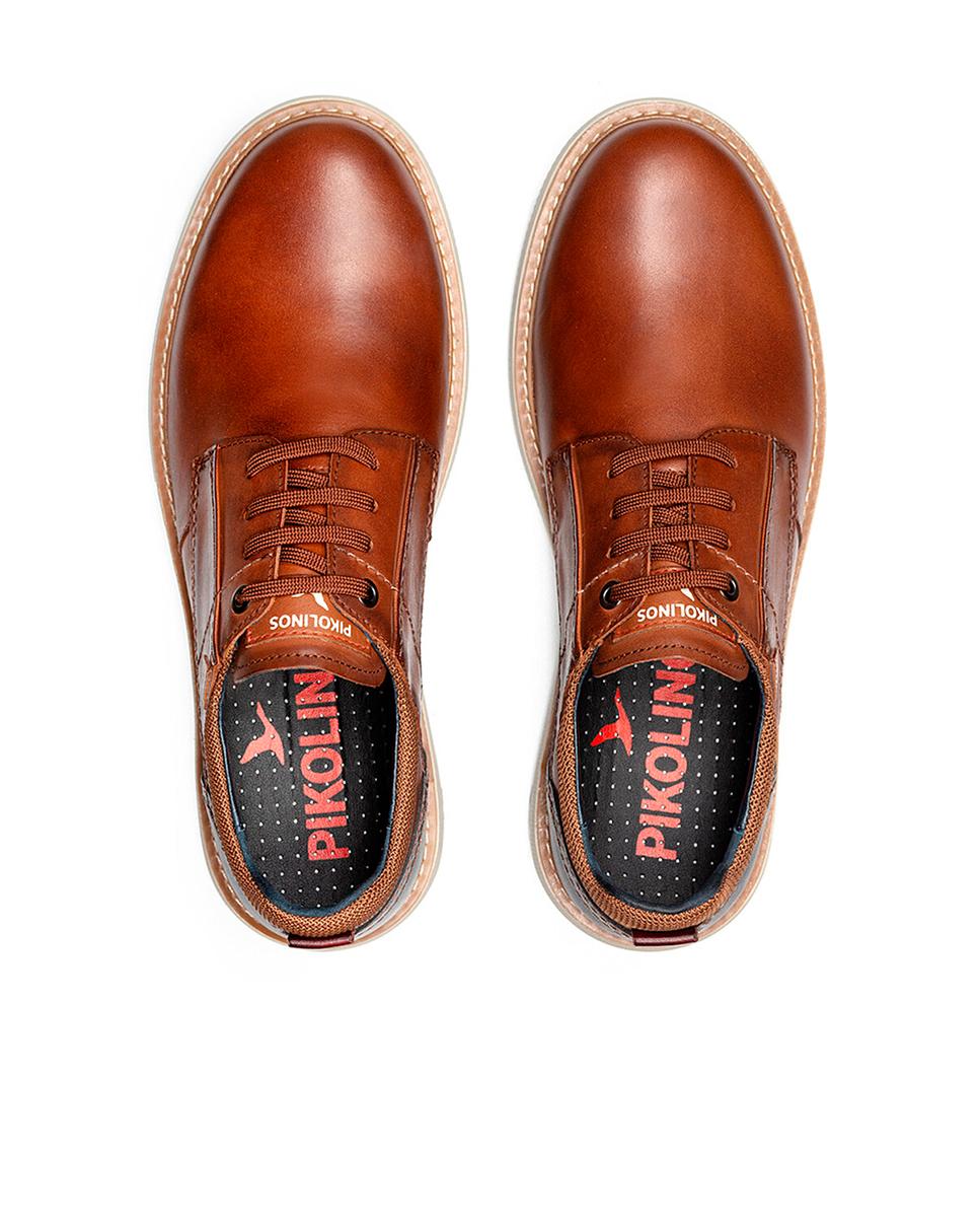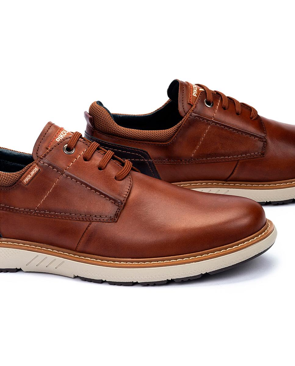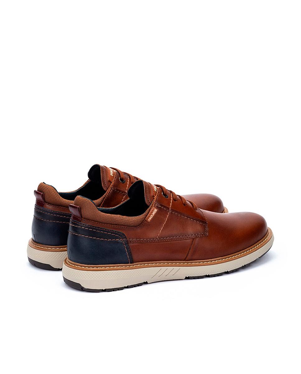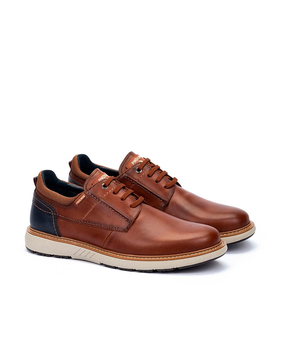 Zapatos casuales para hombre de Pikolinos en piel color marrón con un toque de azul marino en la parte trasera, que aporta contraste y estilo. Diseño estilo oxford con cierre de cordones y acabado en punta redonda. Suela de 3 cm de altura que ofrece comodidad y un look versátil ideal para el día a día.