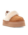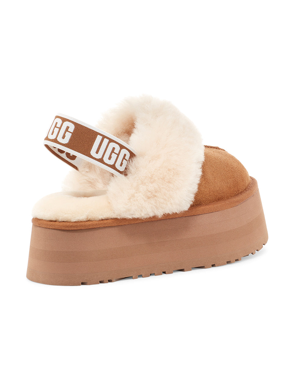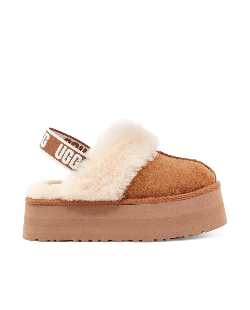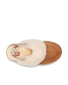 Zuecos de UGG en ante color camel con diseño destalonado y cinta elástica con logo para un ajuste cómodo y moderno. Plataforma de 5 cm que estiliza sin renunciar al confort. Forro cálido de lana reciclada y lyocell, con plantilla mullida y suela EVA ultraligera. El equilibrio perfecto entre estilo relajado, sostenibilidad y comodidad para tus looks invernales.