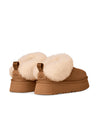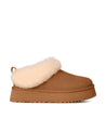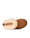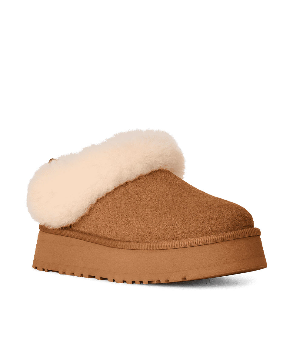 Zuecos de UGG para mujer confeccionados en ante marrón con una plataforma de 4 cm que aporta estilo y comodidad. El interior está forrado con suave peluche en tono contraste, que sobresale sutilmente y decora la parte superior del calzado. Un diseño acogedor y moderno, ideal para looks relajados con un toque distintivo.