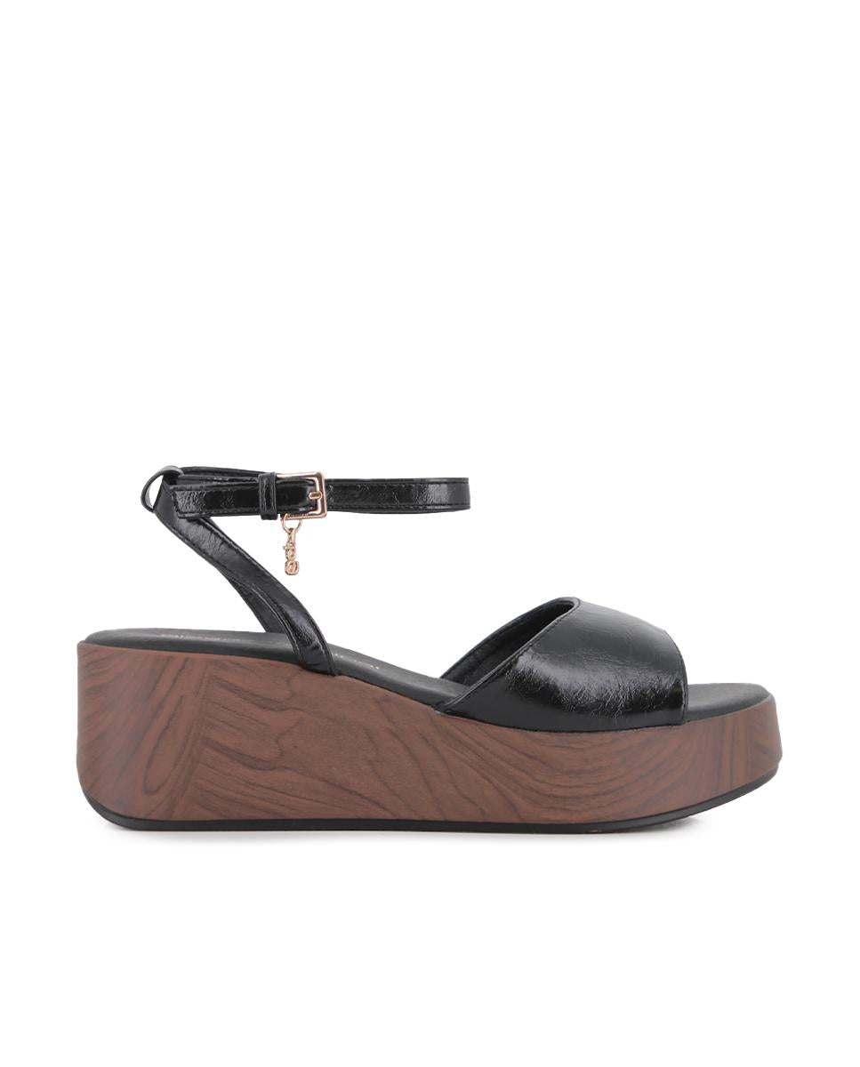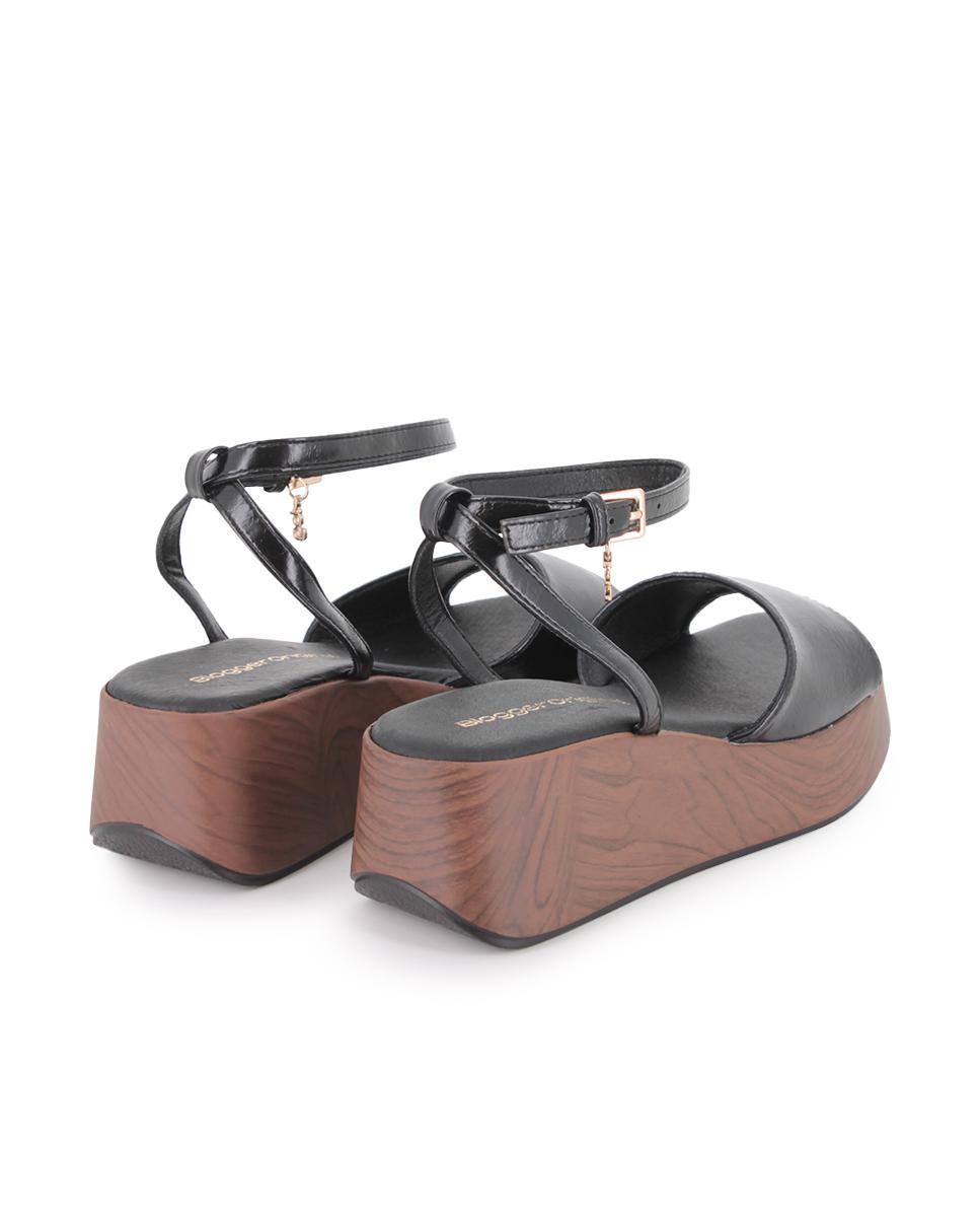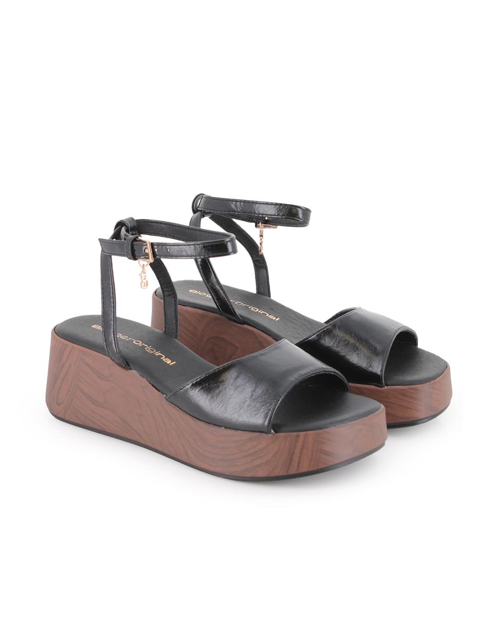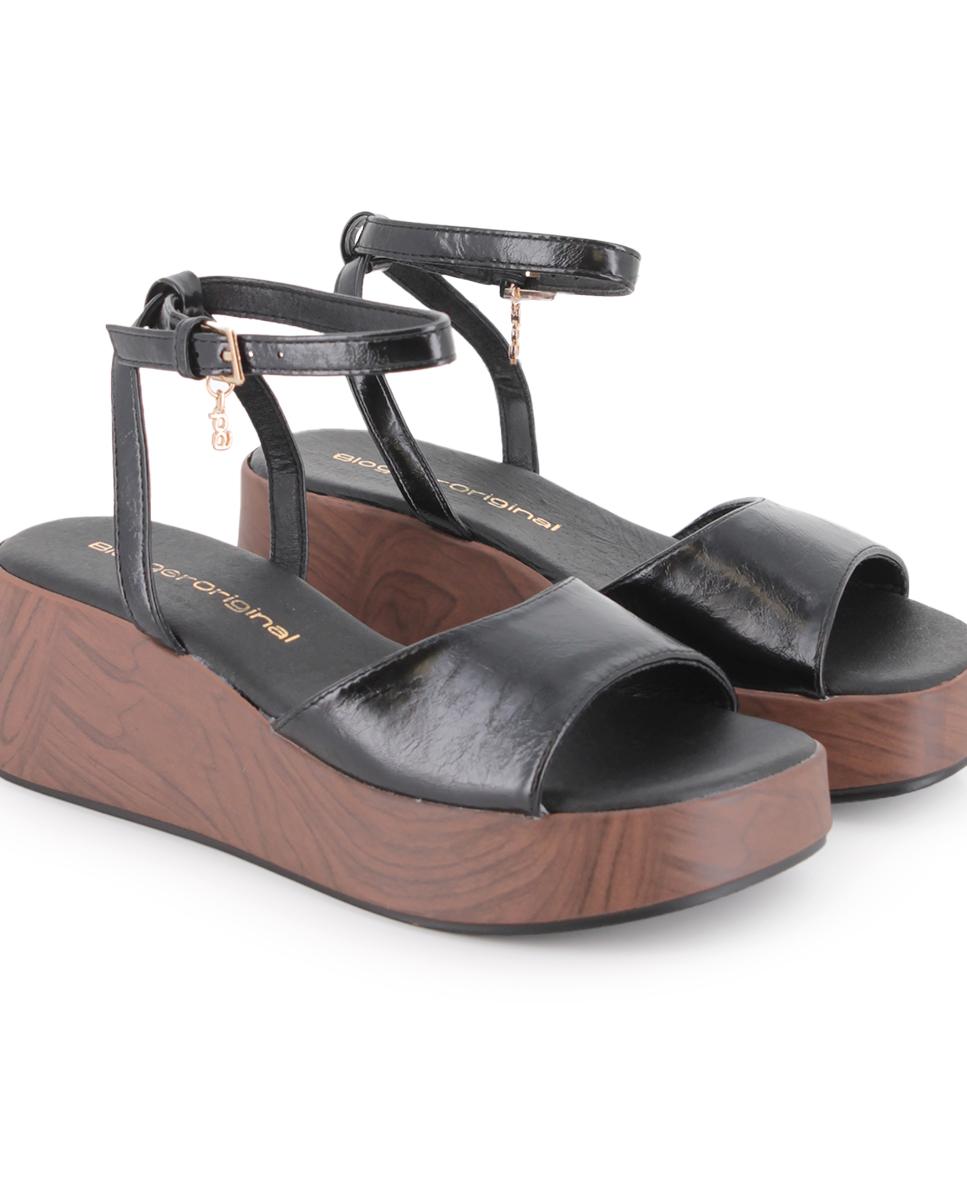Sandalias en piel sintética color negro, con diseño de pala y pulsera al tobillo con cierre de hebilla. Tacón de 6 cm de altura y plataforma delantera de 2,5 cm para mayor comodidad. Forro interior en material sintético y plantilla de piel que brinda suavidad y confort durante todo el día.