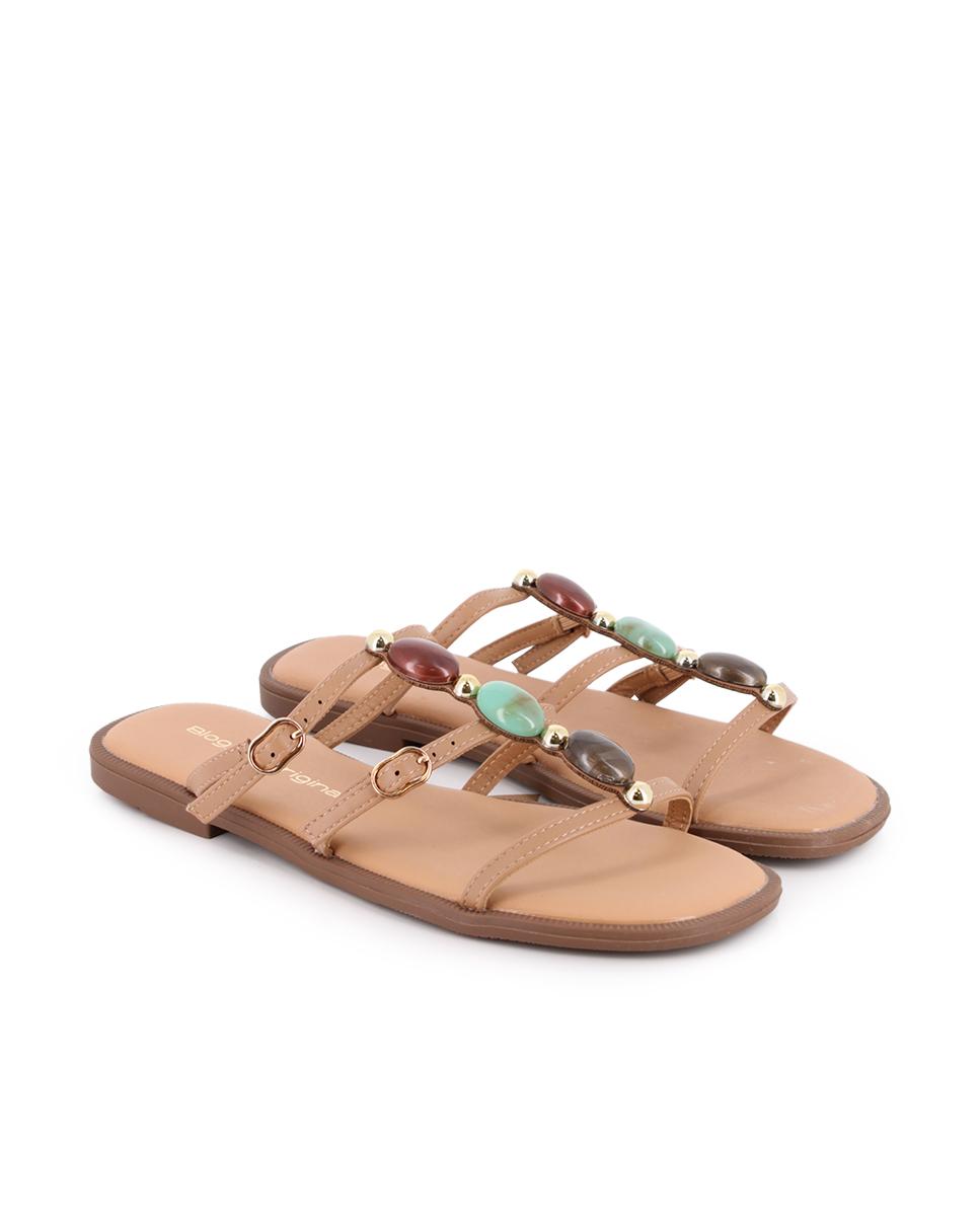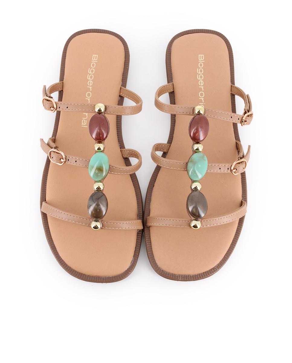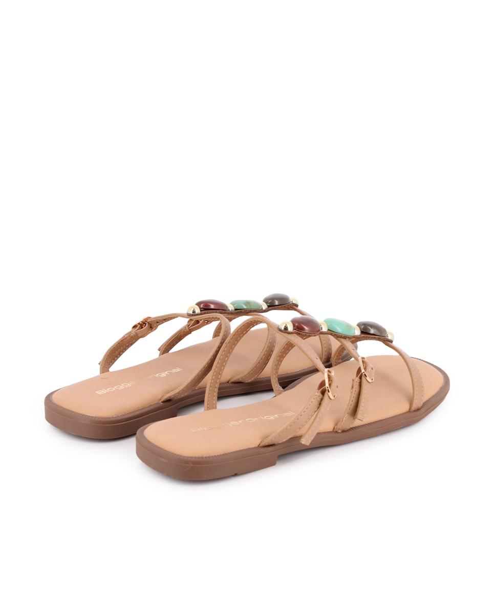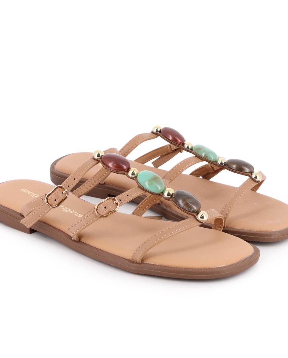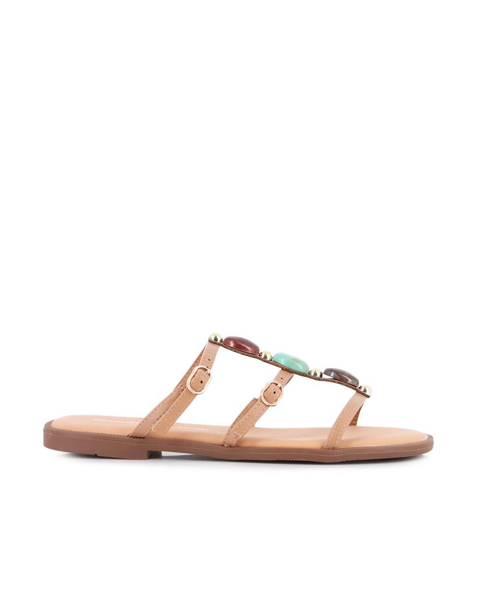 Sandalias planas en piel sintética color camel, perfectas para añadir un toque sofisticado a tus looks diarios. Su parte superior cuenta con tres tiras decoradas con pedrería y hebillas, que aportan brillo y estilo. El piso plano de 1 cm garantiza comodidad, mientras que el forro sintético y la plantilla de piel ofrecen una pisada confortable durante todo el día.
