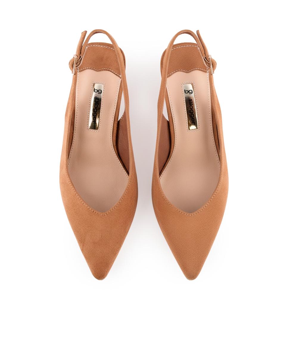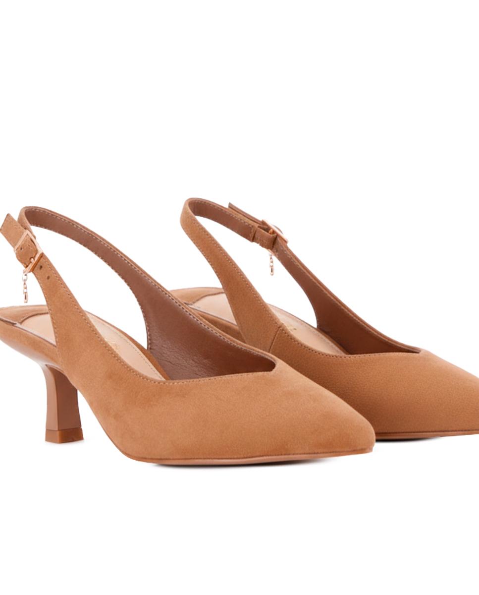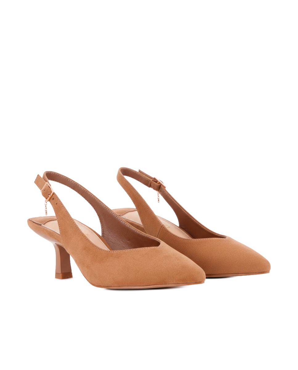 Zapatos de tacón en material sintético color marrón con diseño destalonado y elegante punta fina. Incorporan un tacón fino de 3 cm en color dorado que aporta un toque sofisticado y femenino. Con forro interior sintético y plantilla de piel, ofrecen comodidad y estilo para looks de día o de noche.