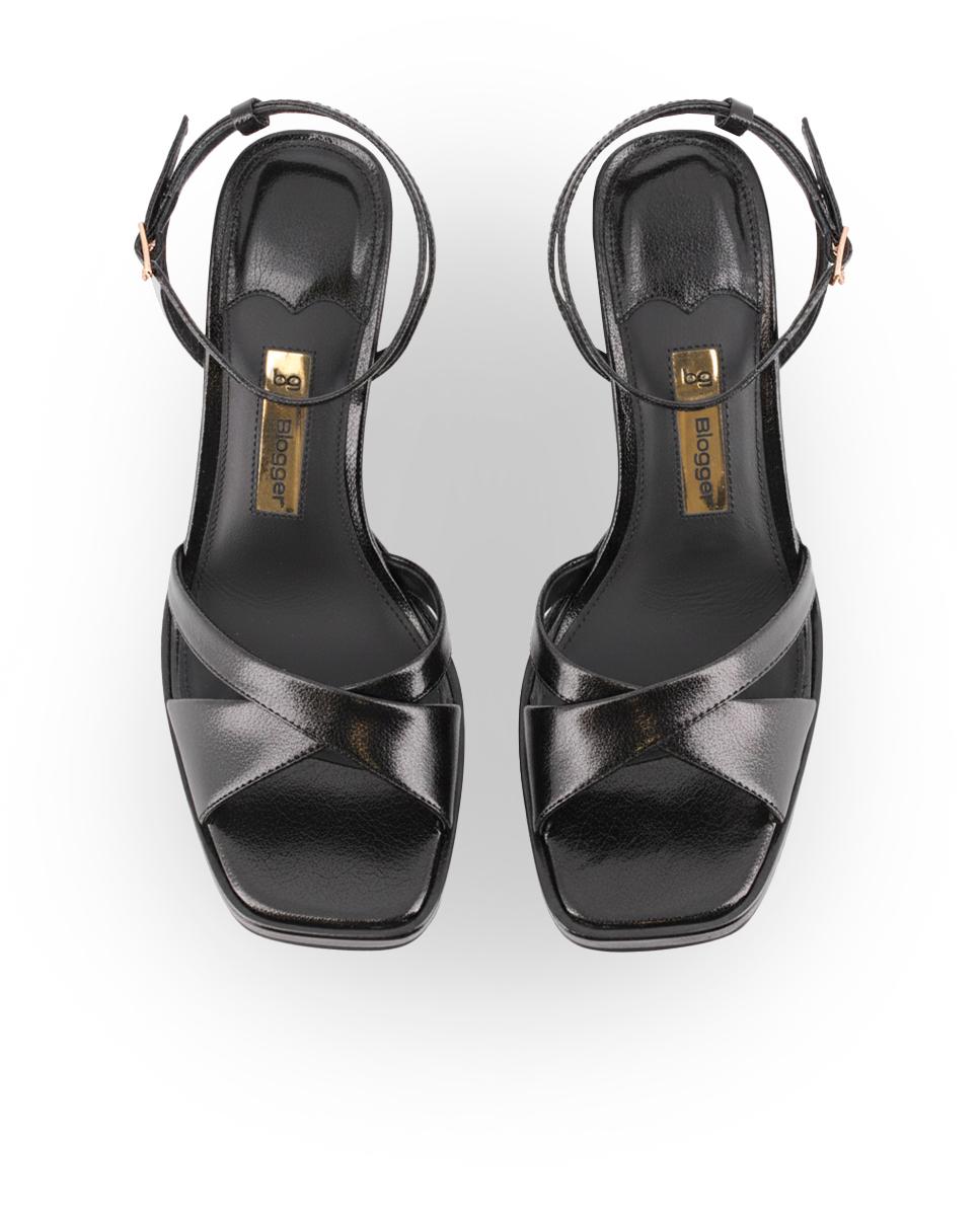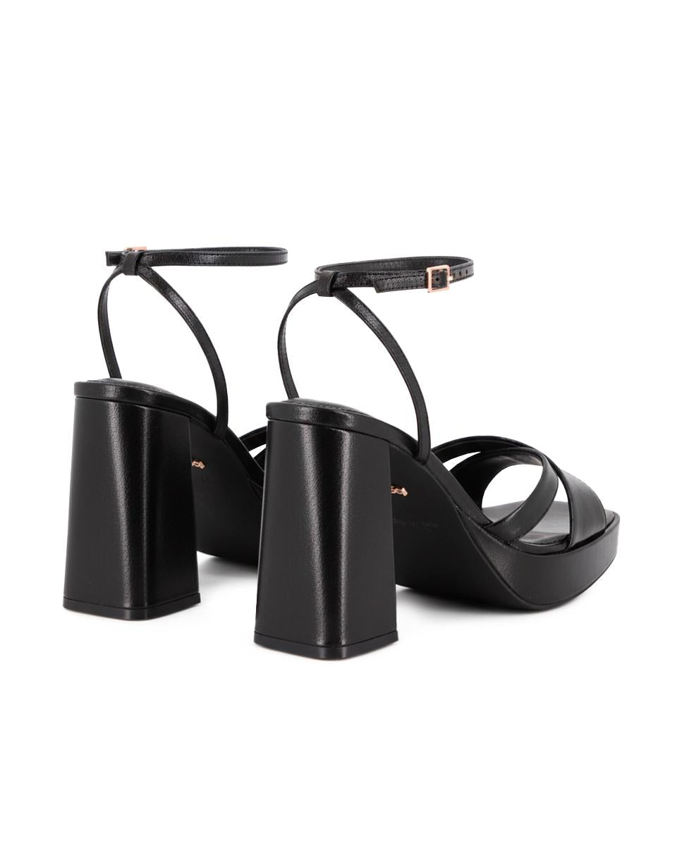 Sandalias en material sintético color negro con tiras cruzadas y pulsera al tobillo con hebilla para un ajuste seguro. Tacón ancho de 10,5 cm que aporta altura y estabilidad. Forro interior en sintético y plantilla en piel, ofreciendo comodidad y soporte durante todo el día. Elegancia y estilo en cada paso.
