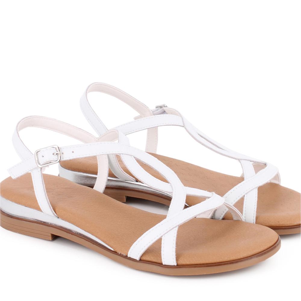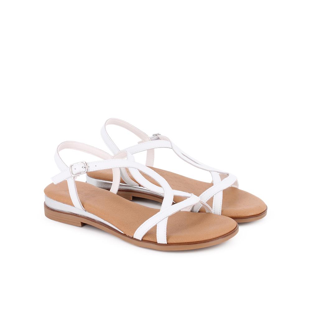Estas sandalias planas de piel en color blanco combinan estilo y comodidad. Cuentan con diseño de tiras y cierre de hebillas, además de un elegante detalle plateado en la entresuela. Con 3 cm de altura, forro interior en piel y plantilla también en piel, ofrecen un calzado sofisticado y confortable, ideal para el día a día.