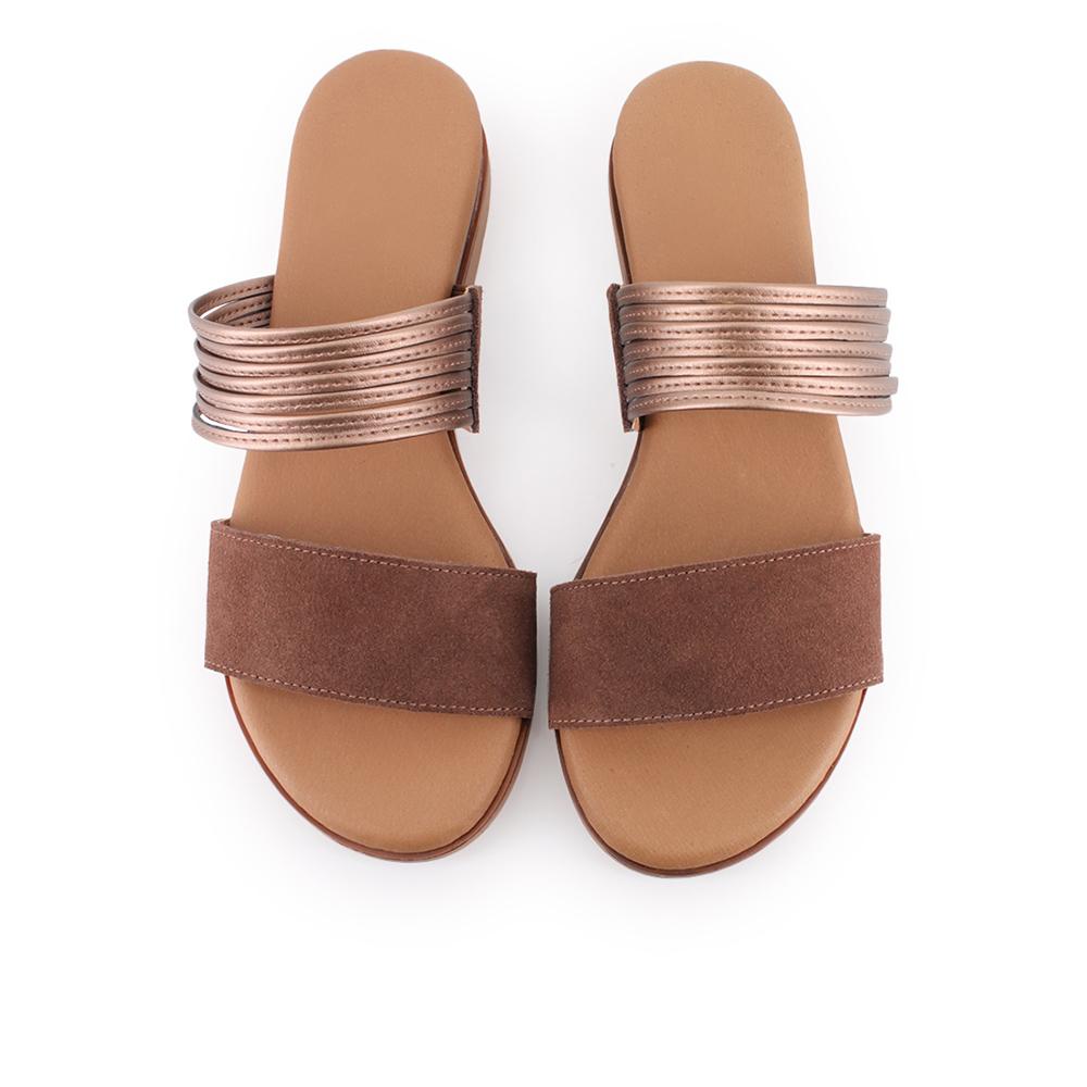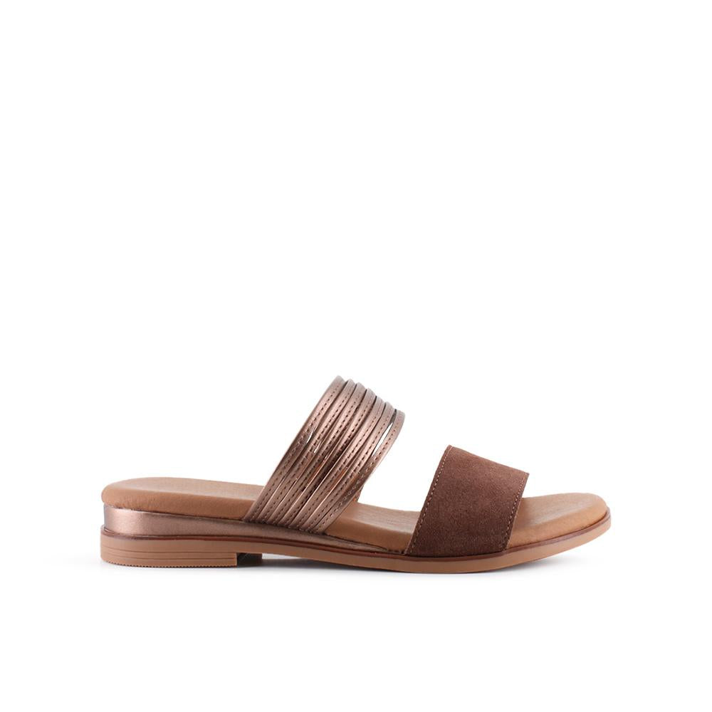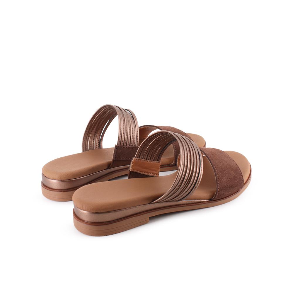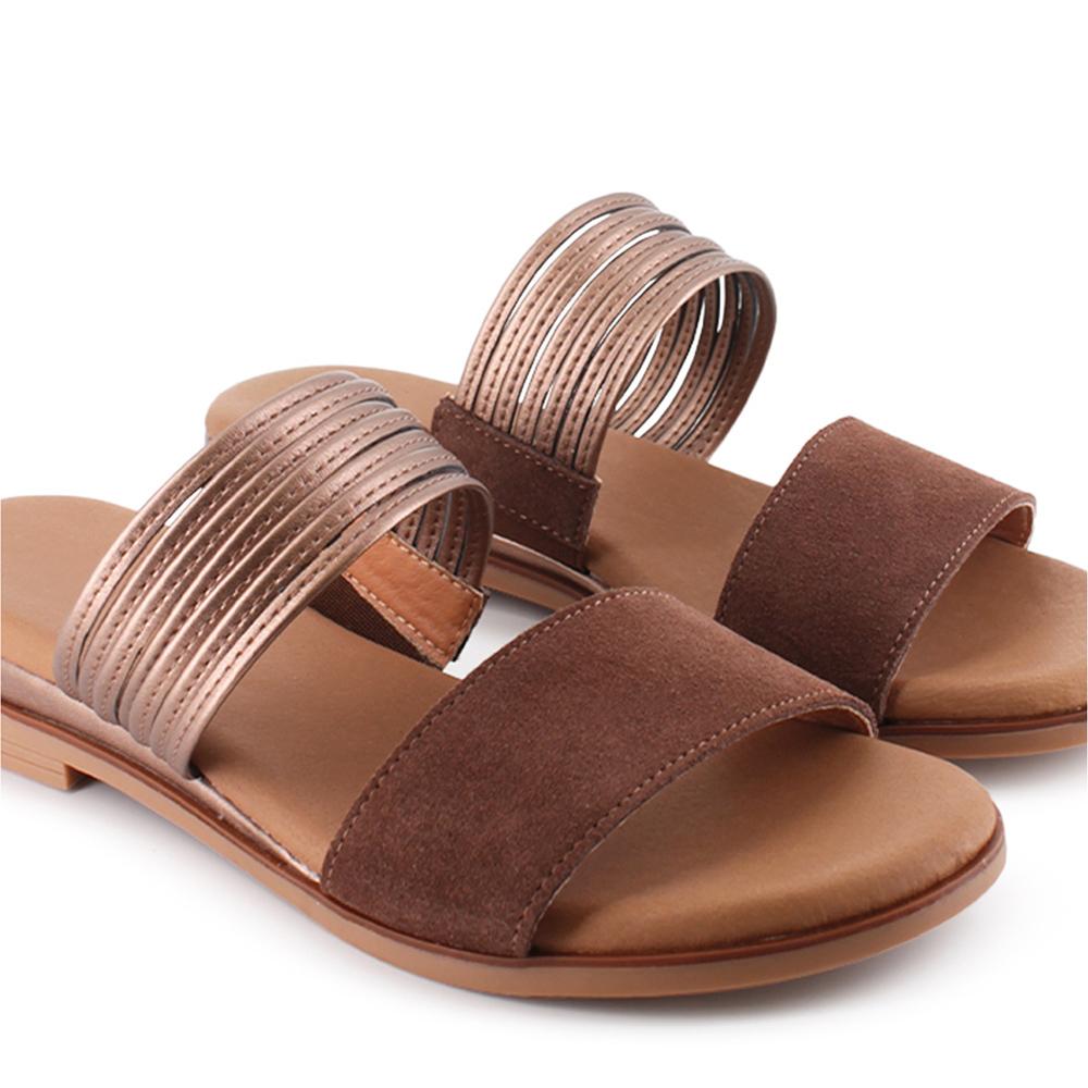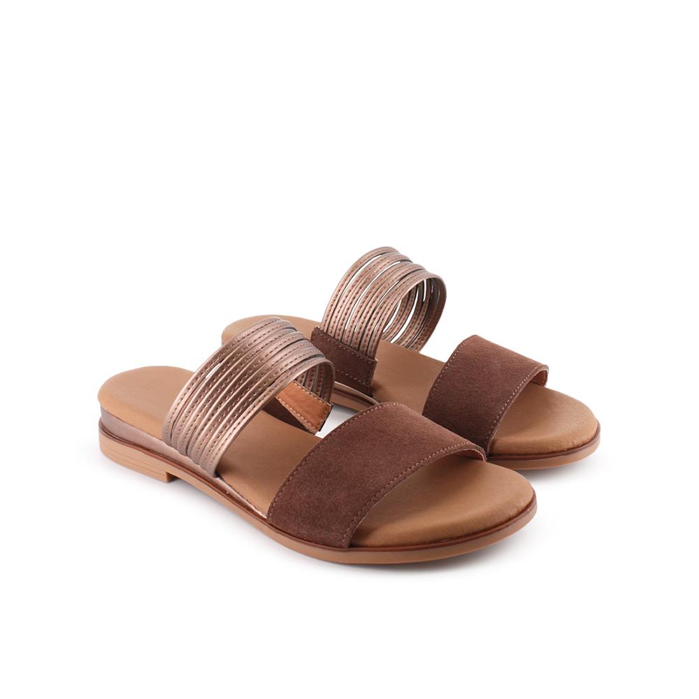 Sandalias planas confeccionadas en piel color marrón, diseñadas con elegantes multitiras en tono bronce que aportan un toque sofisticado a cualquier look. Cuentan con una cómoda altura de 3 cm, forro interior en piel y plantilla también de piel, garantizando suavidad, confort y una pisada agradable durante todo el día.