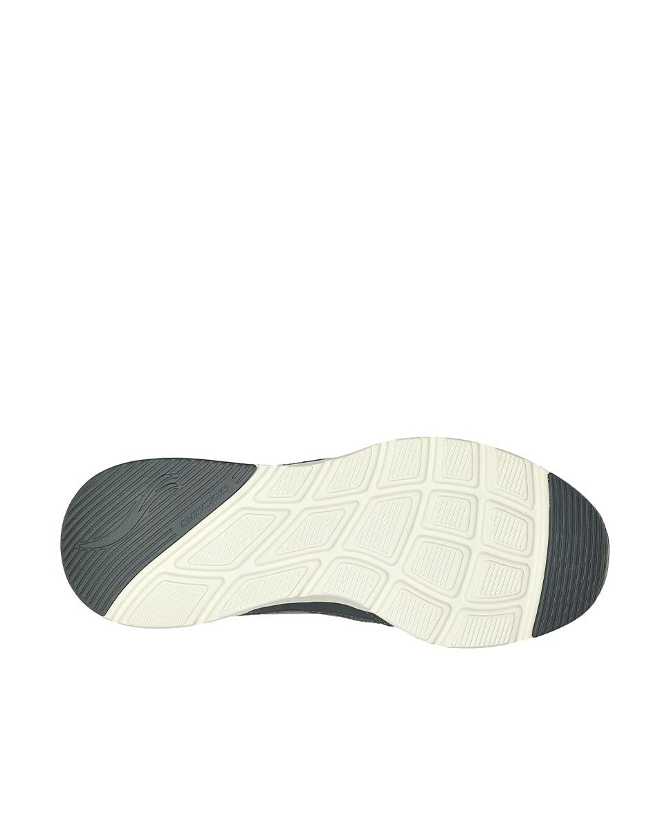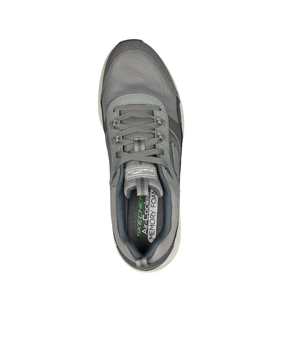 Zapatillas Skechers para hombre con parte superior en piel de gamuza y malla gris. Cuentan con diseño deportivo y cierre de cordones para un ajuste seguro. La plantilla Memory Foam ofrece comodidad, mientras que la entresuela con cámara de aire visible brinda amortiguación y soporte. Con 4 cm de altura, son ideales para uso diario con estilo y confort.
