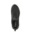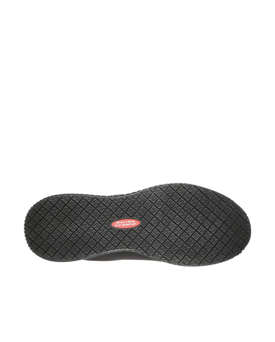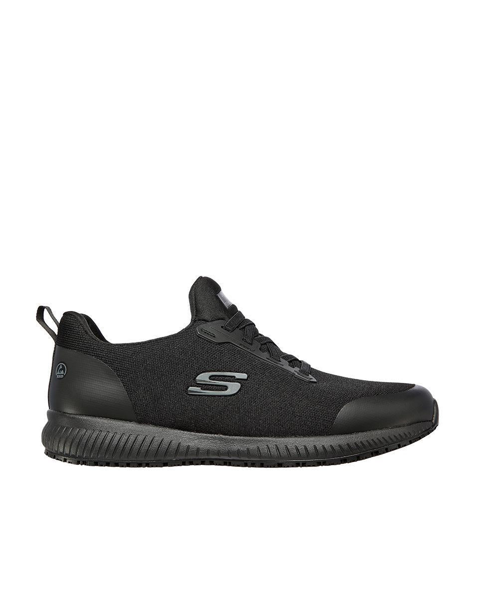 Zapatillas Skechers negras para uso diario, con parte superior de malla suave y material sintético. Diseño antiestático y suela antideslizante para mayor seguridad. La plantilla con amortiguación se adapta al pie, brindando confort y reduciendo impactos. Media suela ligera y flexible para caminar con suavidad. Altura de 3 cm. Comodidad, estilo y funcionalidad en un solo modelo.