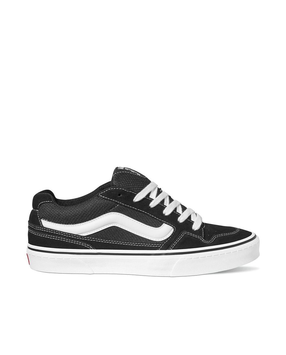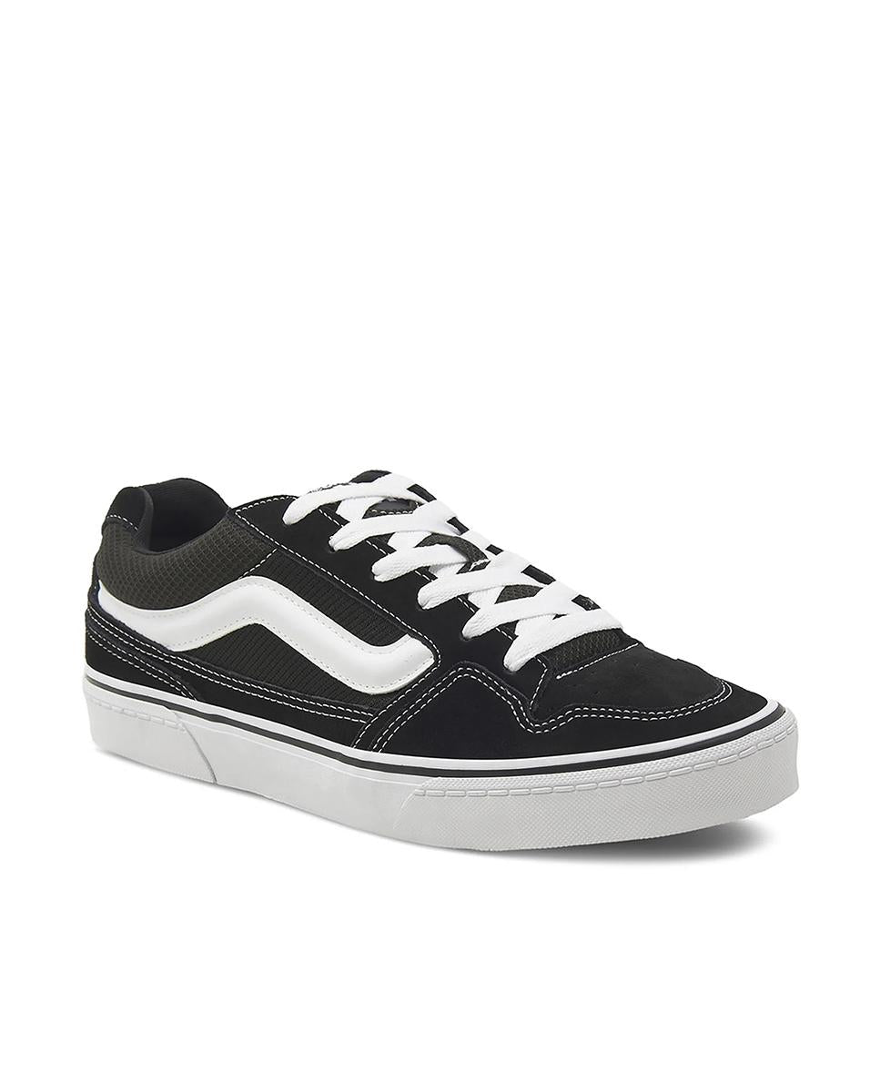Zapatillas Vans para hombre de diseño icónico y estilo urbano. Confeccionadas en lona resistente en color negro con detalles en blanco, ofrecen comodidad diaria y una suela de goma vulcanizada que garantiza agarre y durabilidad. Ideales para looks casuales y uso diario.