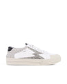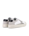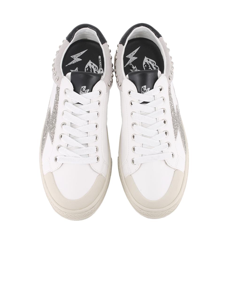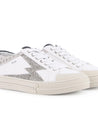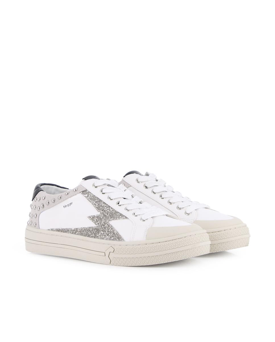 Zapatillas en piel sintética blanca combinada con serraje sintético gris, decoradas con tachuelas y detalles de purpurina para un toque único y moderno. Piso plano de 2,5 cm que garantiza comodidad diaria. Forro interior textil y plantilla sintética. Ideales para un estilo casual y brillante que destaca en cualquier ocasión.