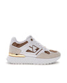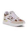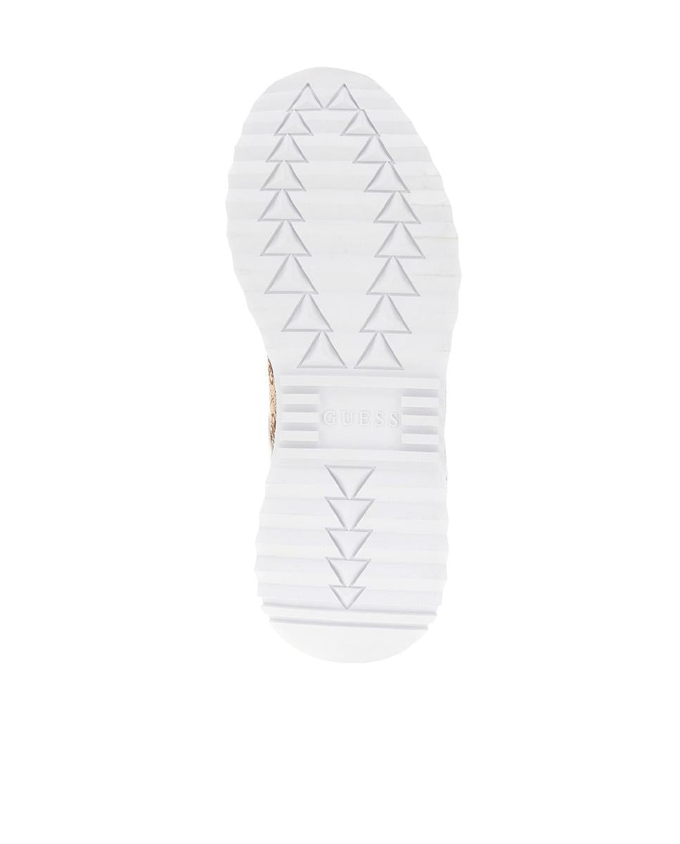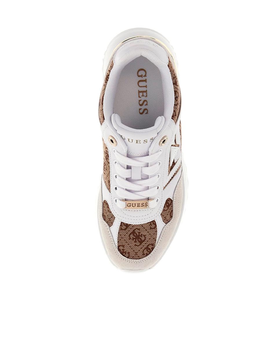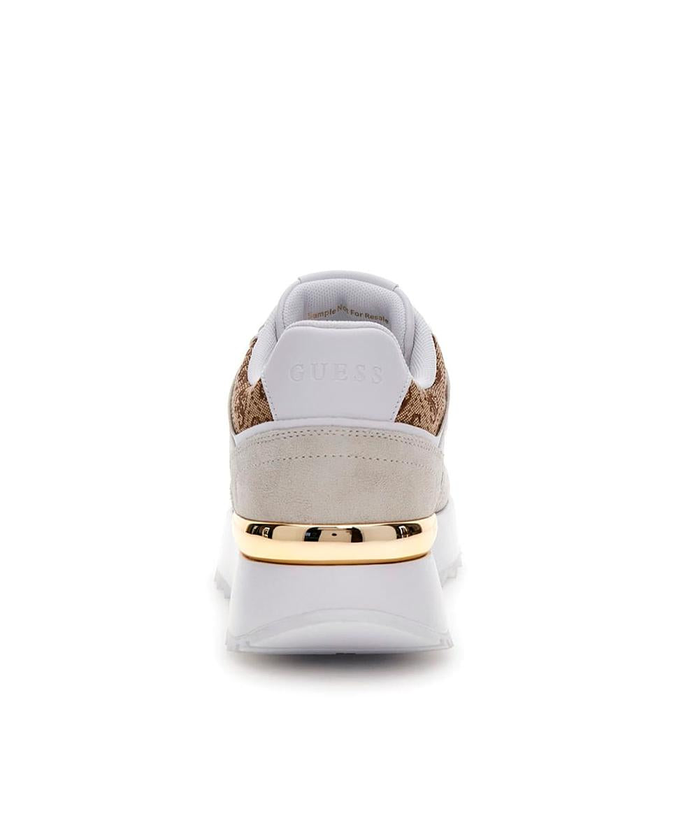 Zapatillas clásicas de estilo running para mujer de Guess. Hechas en piel sintética y textil, combinan blanco, beige y marrón con el estampado icónico de la marca. Detalles dorados en el talón aportan un toque elegante. Con plataforma de 4 cm y cierre en cordones, son ideales para elevar tus looks diarios con comodidad y estilo.