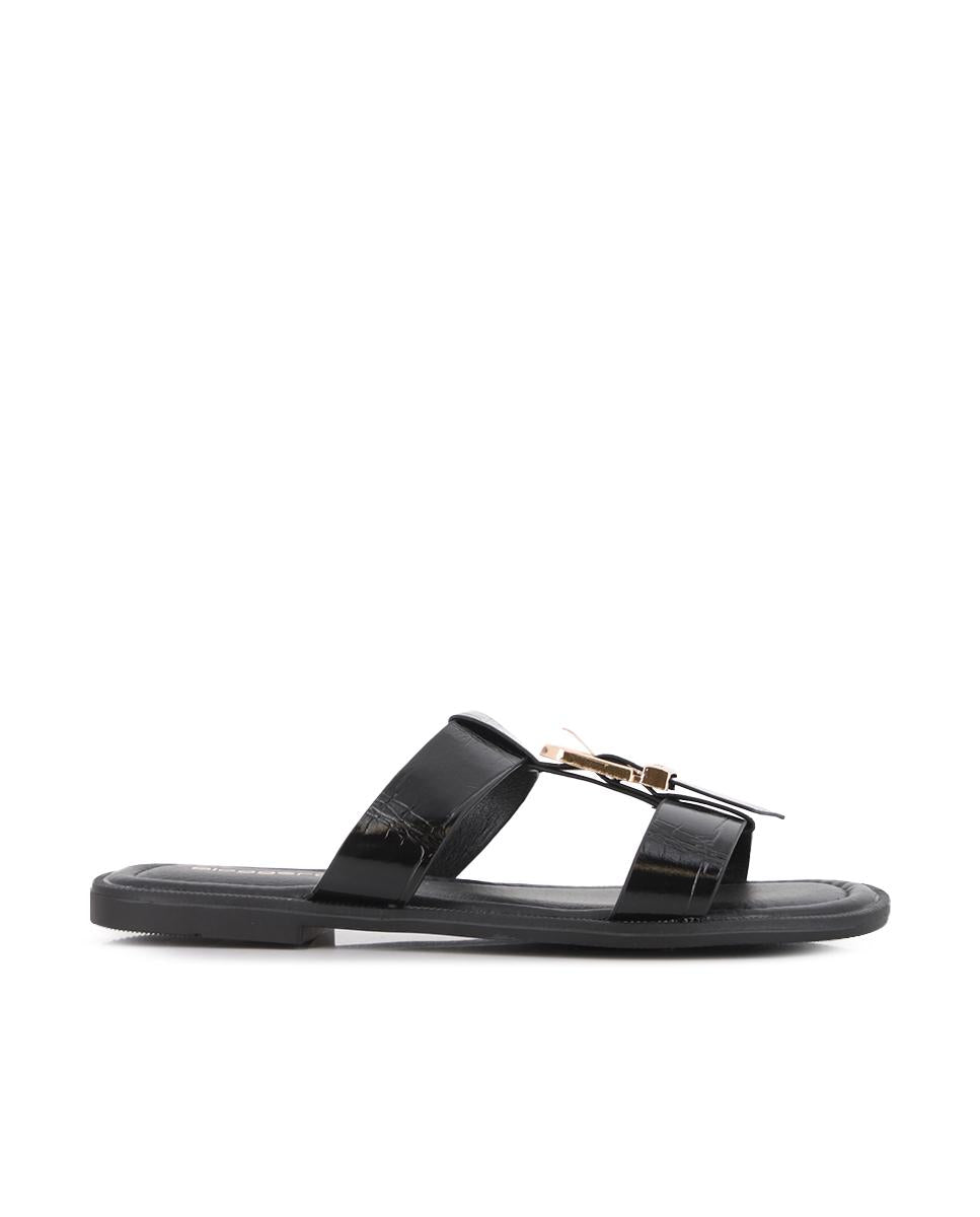 Sandalias planas en piel sintética color negro con textura, diseñadas para un estilo moderno y cómodo. La parte superior presenta un diseño asimétrico con decoración de hebilla dorada, añadiendo un toque sofisticado. Piso plano de 1 cm de altura para comodidad diaria. Forro interior en sintético y plantilla de piel que asegura suavidad y confort en cada paso.